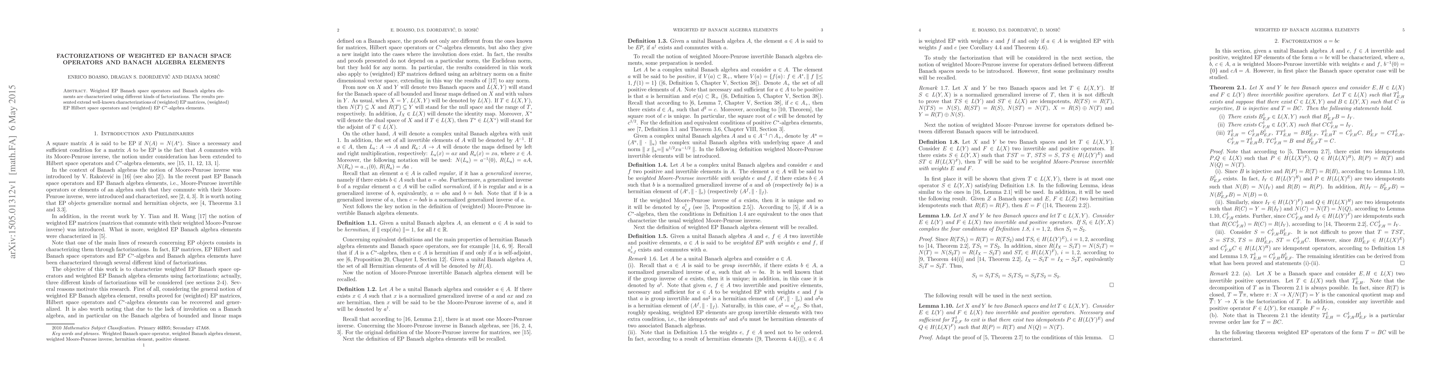 This paper explores factorizations of weighted EP Banach space operators and Banach algebra elements, extending known characterizations of weighted EP matrices, Hilbert space operators, and $C^*$-algebra elements. The study provides new insights into these mathematical structures.
