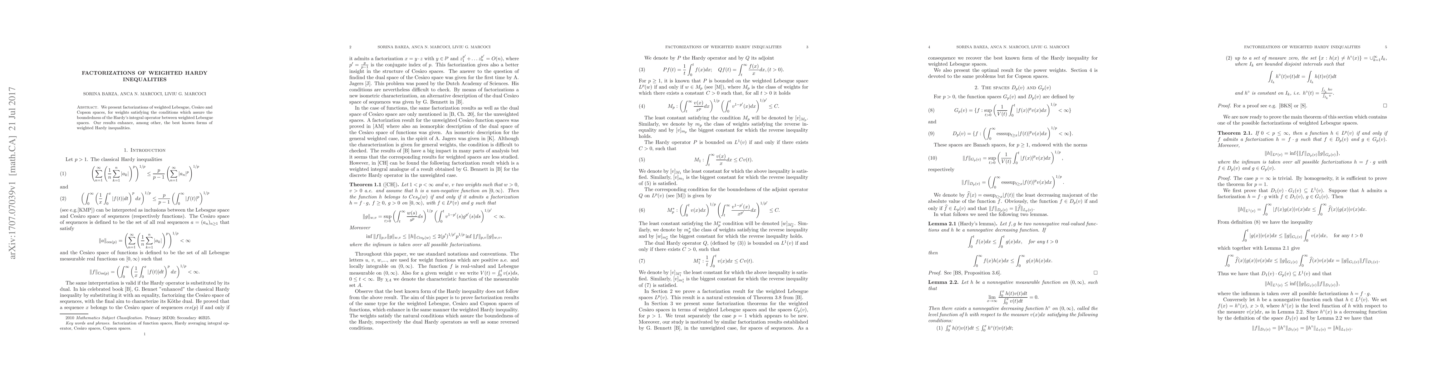 This paper presents factorizations of weighted Lebesgue, Cesàro, and Copson spaces under conditions ensuring the boundedness of Hardy's integral operator, thereby improving the best known forms of weighted Hardy inequalities.
