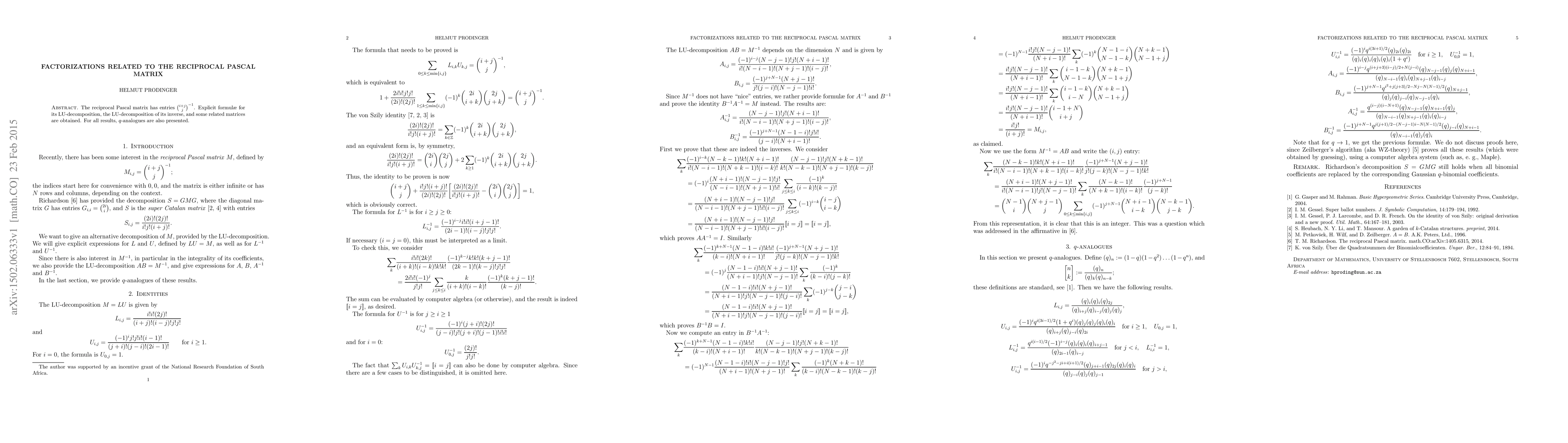The reciprocal Pascal matrix has entries $\binom{i+j}{j}^{-1}$. Explicit formullae for its LU-decomposition, the LU-decomposition of its inverse, and some related matrices are obtained. For all results, $q$-analogues are also presented.