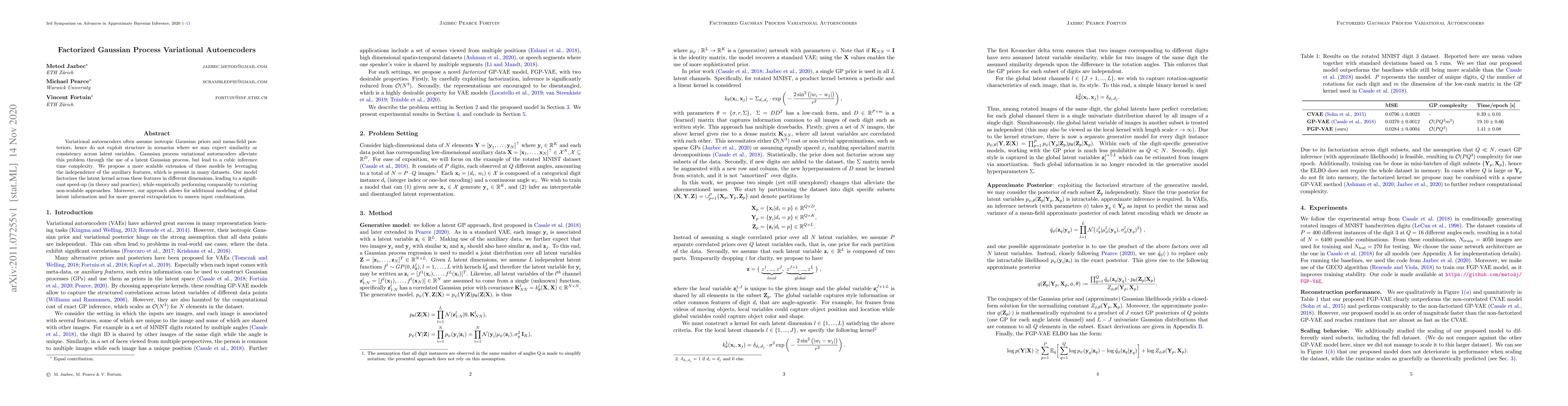 This paper proposes a scalable factorized Gaussian process variational autoencoder that reduces cubic inference time complexity by leveraging the independence of auxiliary features. The factorized latent kernel across different dimensions significantly speeds up inference while maintaining comparable performance and enabling better modeling of global latent information.