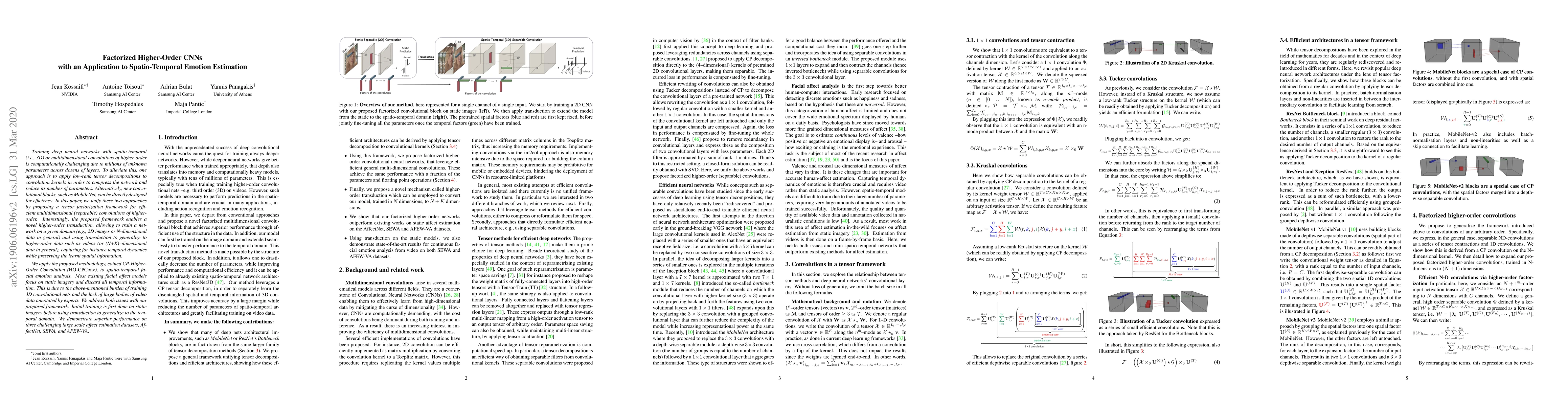 Training deep neural networks with spatio-temporal (i.e., 3D) or multidimensional convolutions of higher-order is computationally challenging due to millions of unknown parameters across dozens of layers. To alleviate this, one approach is to apply low-rank tensor decompositions to convolution kernels in order to compress the network and reduce its number of parameters. Alternatively, new convolutional blocks, such as MobileNet, can be directly designed for efficiency. In this paper, we unify these two approaches by proposing a tensor factorization framework for efficient multidimensional (separable) convolutions of higher-order. Interestingly, the proposed framework enables a novel higher-order transduction, allowing to train a network on a given domain (e.g., 2D images or N-dimensional data in general) and using transduction to generalize to higher-order data such as videos (or (N+K)-dimensional data in general), capturing for instance temporal dynamics while preserving the learnt spatial information. We apply the proposed methodology, coined CP-Higher-Order Convolution (HO-CPConv), to spatio-temporal facial emotion analysis. Most existing facial affect models focus on static imagery and discard all temporal information. This is due to the above-mentioned burden of training 3D convolutional nets and the lack of large bodies of video data annotated by experts. We address both issues with our proposed framework. Initial training is first done on static imagery before using transduction to generalize to the temporal domain. We demonstrate superior performance on three challenging large scale affect estimation datasets, AffectNet, SEWA, and AFEW-VA.
