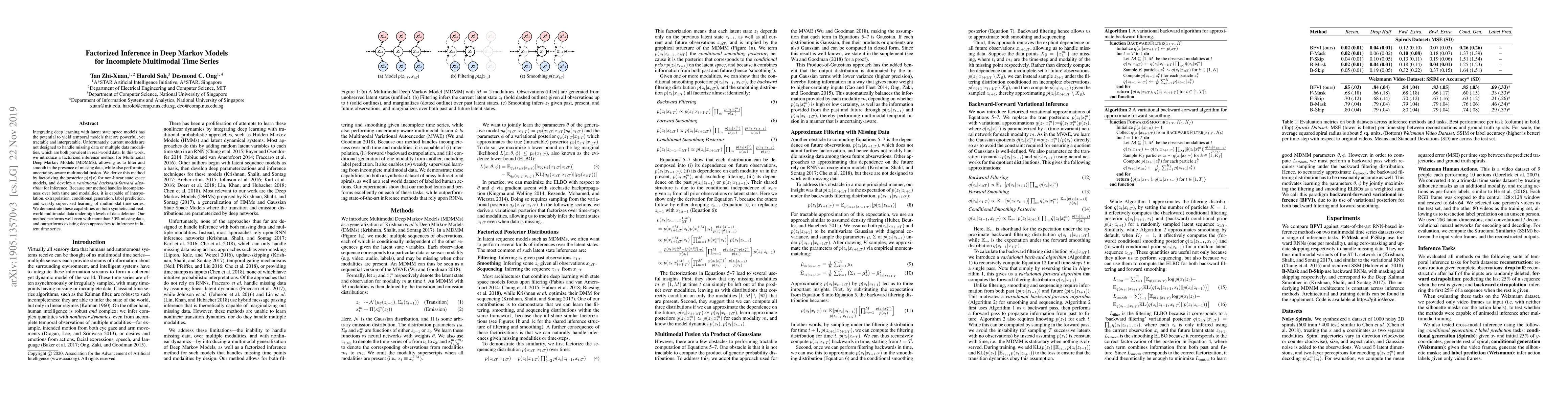 Integrating deep learning with latent state space models has the potential to yield temporal models that are powerful, yet tractable and interpretable. Unfortunately, current models are not designed to handle missing data or multiple data modalities, which are both prevalent in real-world data. In this work, we introduce a factorized inference method for Multimodal Deep Markov Models (MDMMs), allowing us to filter and smooth in the presence of missing data, while also performing uncertainty-aware multimodal fusion. We derive this method by factorizing the posterior p(z|x) for non-linear state space models, and develop a variational backward-forward algorithm for inference. Because our method handles incompleteness over both time and modalities, it is capable of interpolation, extrapolation, conditional generation, label prediction, and weakly supervised learning of multimodal time series. We demonstrate these capabilities on both synthetic and real-world multimodal data under high levels of data deletion. Our method performs well even with more than 50% missing data, and outperforms existing deep approaches to inference in latent time series.