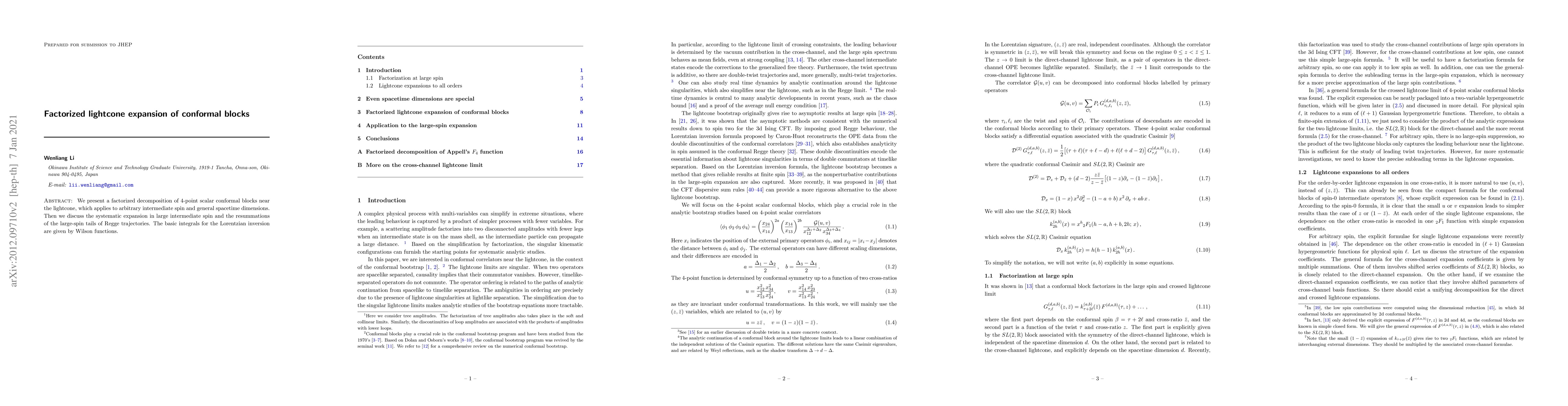 This paper introduces a factorized decomposition of 4-point scalar conformal blocks near the lightcone for arbitrary intermediate spin and dimensions. It also explores systematic expansions in large intermediate spin and the resummation of large-spin tails, utilizing Wilson functions for Lorentzian inversion.