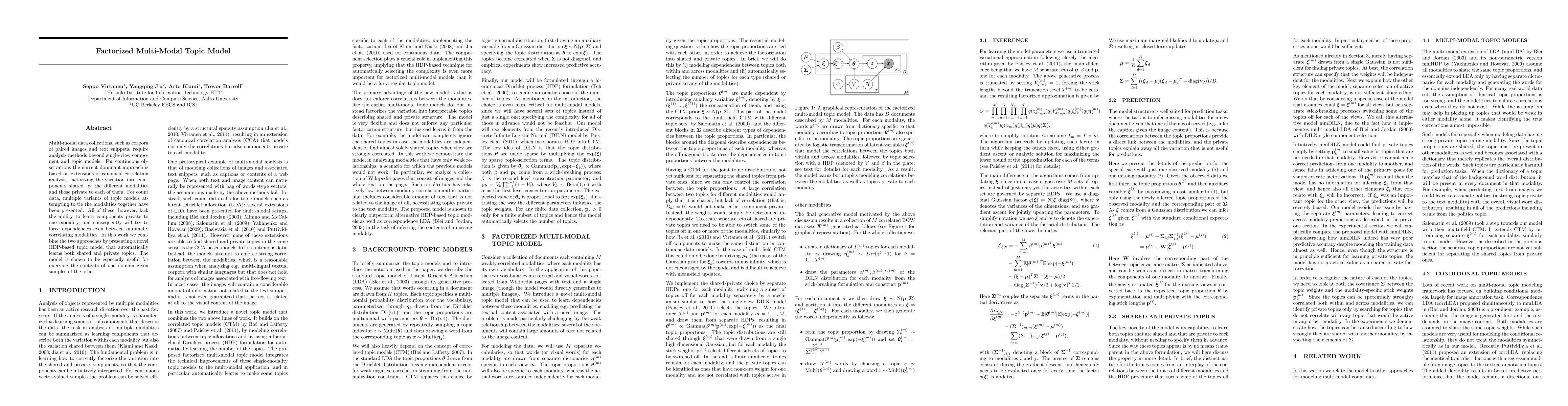 This paper introduces a novel factorized multi-modal topic model that combines shared and private topic learning for continuous and count data. It effectively analyzes paired data like images and text, enabling better querying across modalities.