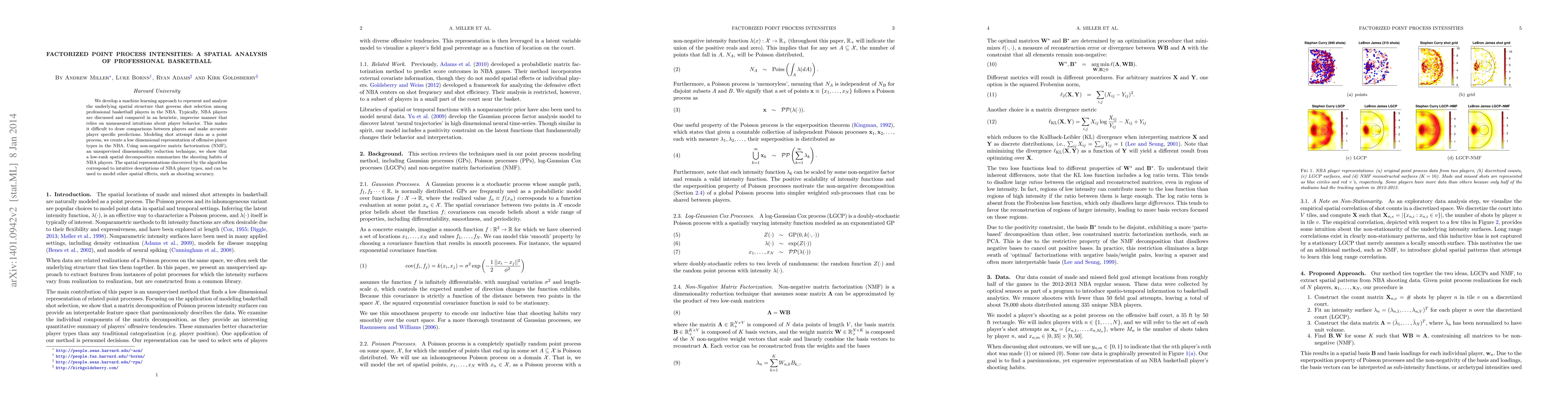 We develop a machine learning approach to represent and analyze the underlying spatial structure that governs shot selection among professional basketball players in the NBA. Typically, NBA players are discussed and compared in an heuristic, imprecise manner that relies on unmeasured intuitions about player behavior. This makes it difficult to draw comparisons between players and make accurate player specific predictions. Modeling shot attempt data as a point process, we create a low dimensional representation of offensive player types in the NBA. Using non-negative matrix factorization (NMF), an unsupervised dimensionality reduction technique, we show that a low-rank spatial decomposition summarizes the shooting habits of NBA players. The spatial representations discovered by the algorithm correspond to intuitive descriptions of NBA player types, and can be used to model other spatial effects, such as shooting accuracy.