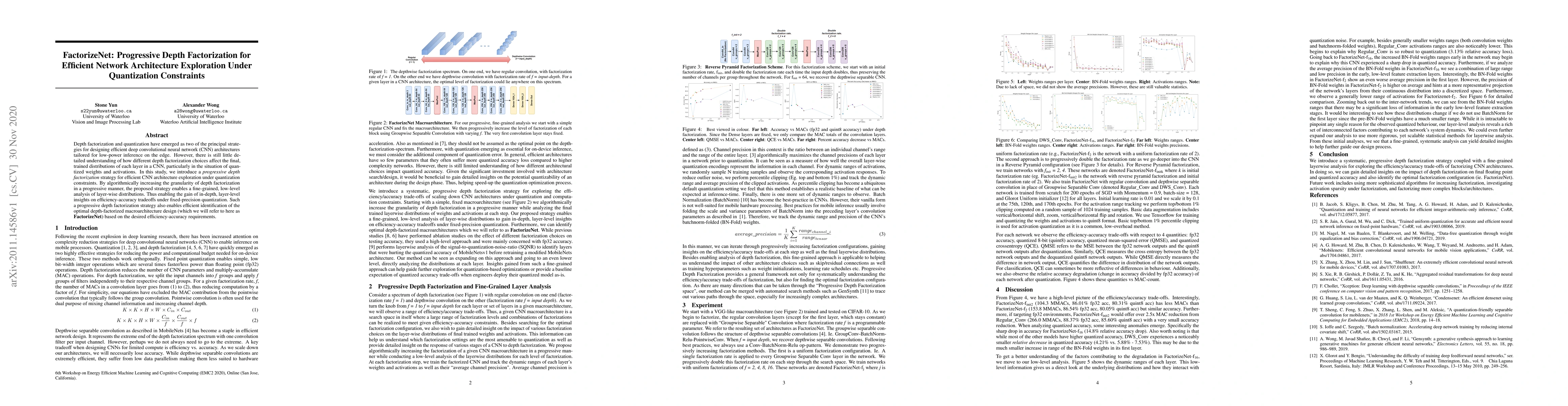 This research introduces FactorizeNet, a progressive depth factorization strategy for designing efficient CNN architectures under quantization constraints. It allows fine-grained analysis of layer-wise distributions, providing insights into efficiency-accuracy tradeoffs, and aids in identifying optimal macroarchitecture designs for specific efficiency-accuracy requirements.