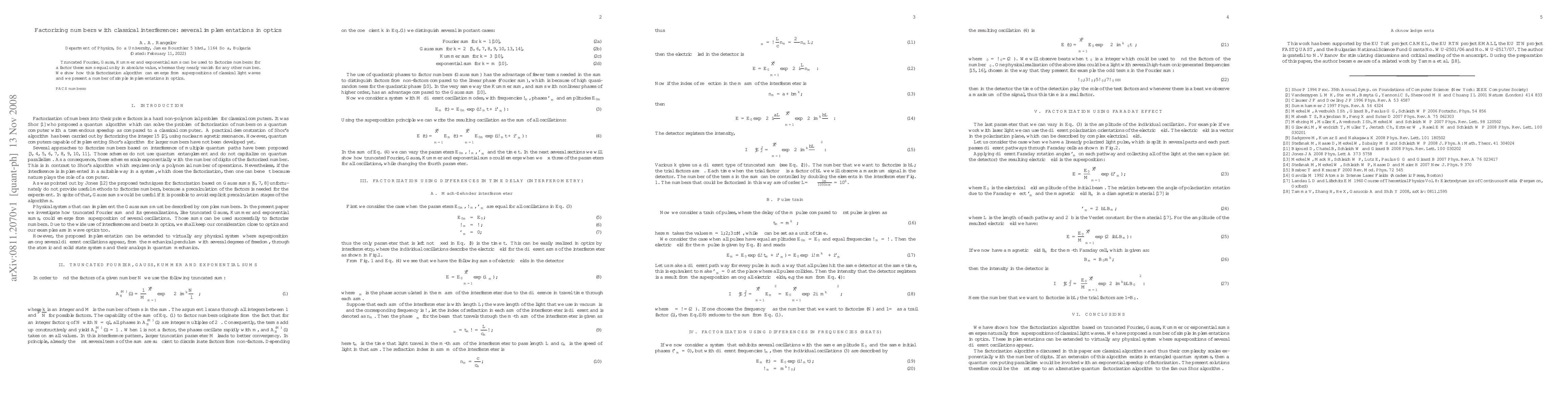 This paper explores the use of classical interference phenomena in optics to factorize numbers, leveraging truncated Fourier, Gauss, Kummer, and exponential sums. It demonstrates how these mathematical sums can be realized through superpositions of light waves, providing simple optical implementations for number factorization.