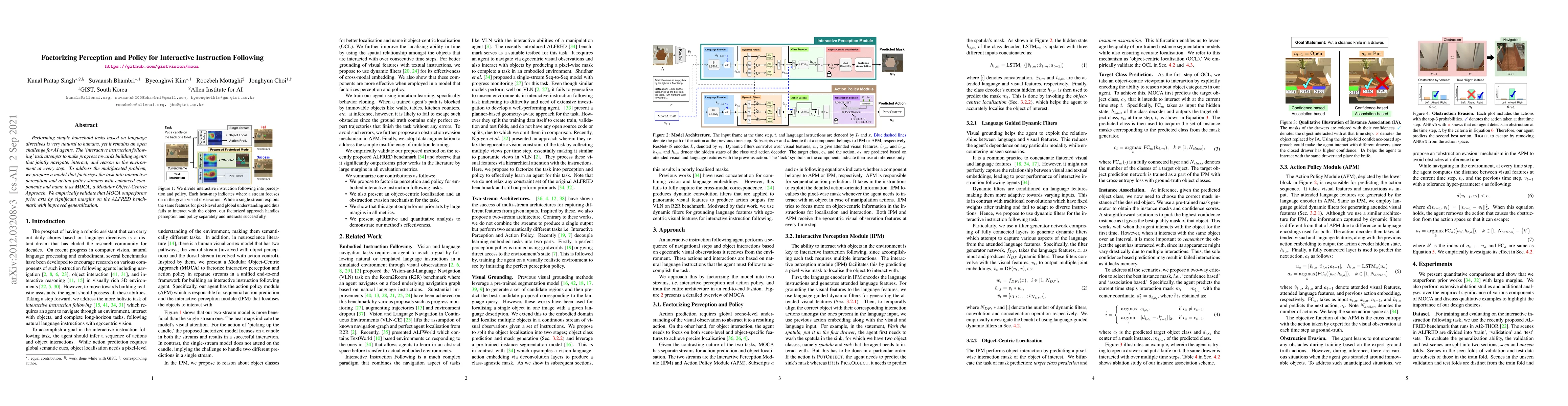 Performing simple household tasks based on language directives is very natural to humans, yet it remains an open challenge for AI agents. The 'interactive instruction following' task attempts to make progress towards building agents that jointly navigate, interact, and reason in the environment at every step. To address the multifaceted problem, we propose a model that factorizes the task into interactive perception and action policy streams with enhanced components and name it as MOCA, a Modular Object-Centric Approach. We empirically validate that MOCA outperforms prior arts by significant margins on the ALFRED benchmark with improved generalization.