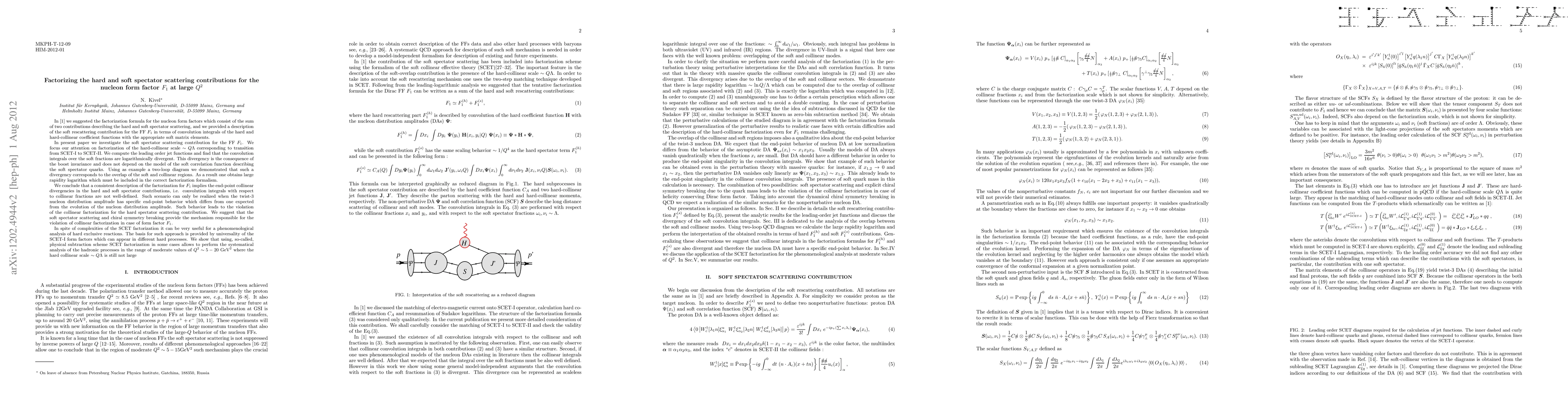We investigate the soft spectator scattering contribution for the FF $F_{1}$. We focus our attention on factorization of the hard-collinear scale $\sim Q\Lambda$ corresponding to transition from SCET-I to SCET-II. We compute the leading order jet functions and find that the convolution integrals over the soft fractions are logarithmically divergent. This divergency is the consequence of the boost invariance and does not depend on the model of the soft correlation function describing the soft spectator quarks. Using as example a two-loop diagram we demonstrated that such a divergency corresponds to the overlap of the soft and collinear regions. As a result one obtains large rapidity logarithm which must be included in the correct factorization formalism. We conclude that a consistent description of the factorization for $F_{1}$ implies the end-point collinear divergencies in the hard and soft spectator contributions, i.e. convolution integrals with respect to collinear fractions are not well-defined. Such scenario can only be realized when the twist-3 nucleon distribution amplitude has specific end-point behavior which differs from one expected from the evolution of the nucleon distribution amplitude. Such behavior leads to the violation of the collinear factorization for the hard spectator scattering contribution. We suggest that the soft spectator scattering and chiral symmetry breaking provide the mechanism responsible for the violation of collinear factorization in case of form factor $F_{1}$.