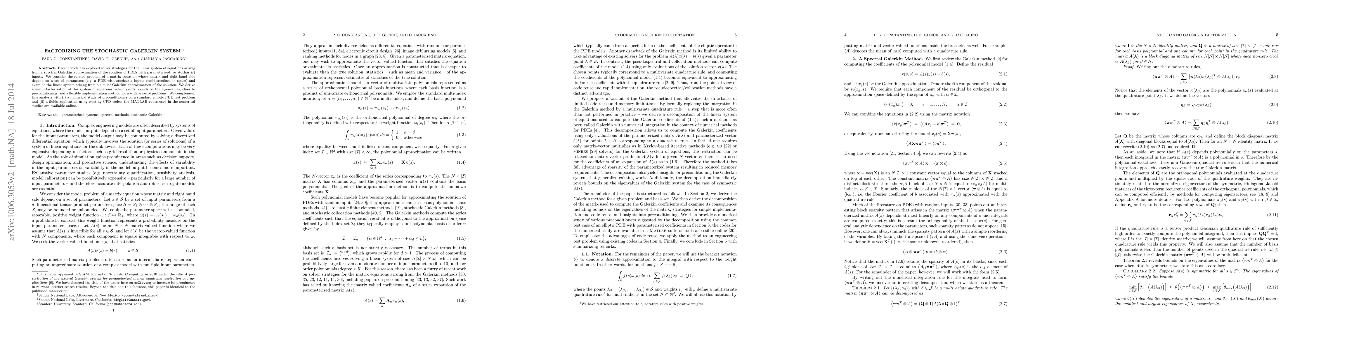 Recent work has explored solver strategies for the linear system of equations arising from a spectral Galerkin approximation of the solution of PDEs with parameterized (or stochastic) inputs. We consider the related problem of a matrix equation whose matrix and right hand side depend on a set of parameters (e.g. a PDE with stochastic inputs semidiscretized in space) and examine the linear system arising from a similar Galerkin approximation of the solution. We derive a useful factorization of this system of equations, which yields bounds on the eigenvalues, clues to preconditioning, and a flexible implementation method for a wide array of problems. We complement this analysis with (i) a numerical study of preconditioners on a standard elliptic PDE test problem and (ii) a fluids application using existing CFD codes; the MATLAB codes used in the numerical studies are available online.