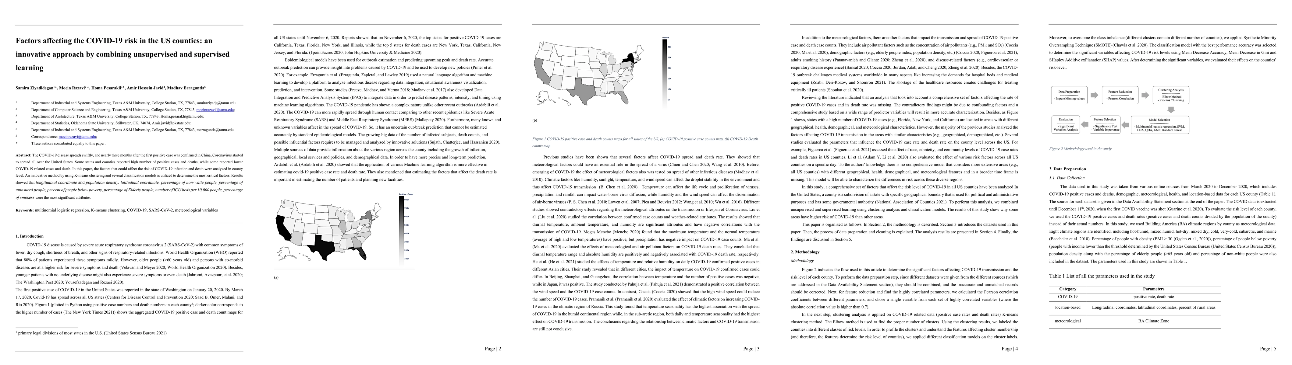 This paper employs a combination of unsupervised and supervised learning to analyze COVID-19 risk factors at the US county level. Key findings highlight that mean temperature, poverty rates, adult obesity, air pressure, population density, wind speed, longitude, and insurance coverage are the most significant predictors of COVID-19 infection and mortality rates.