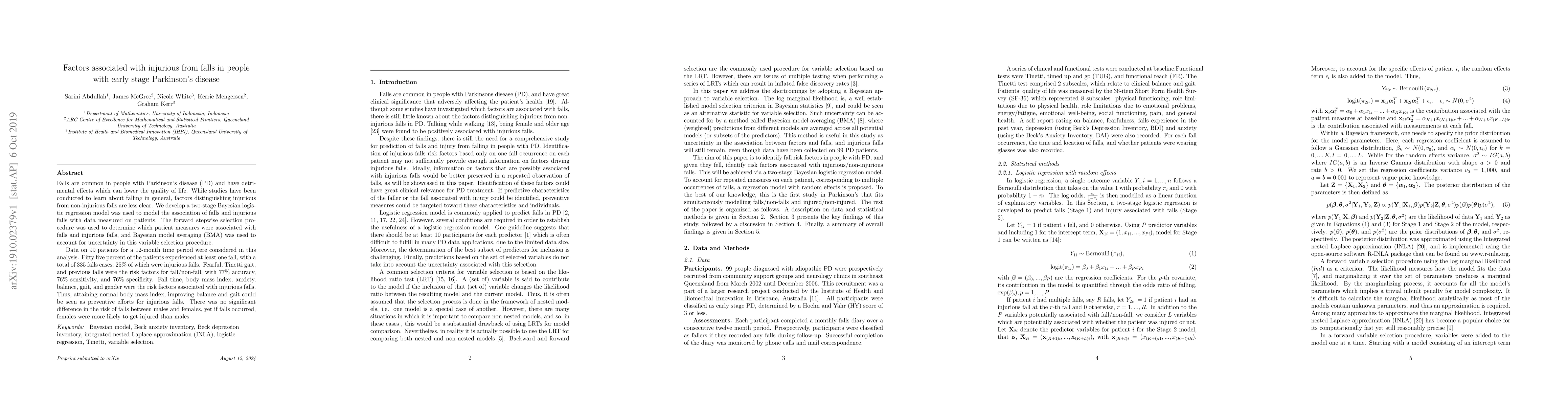 Falls are common in people with Parkinson's disease (PD) and have detrimental effects which can lower the quality of life. While studies have been conducted to learn about falling in general, factors distinguishing injurious from non-injurious falls are less clear. We develop a two-stage Bayesian logistic regression model was used to model the association of falls and injurious falls with data measured on patients. The forward stepwise selection procedure was used to determine which patient measures were associated with falls and injurious falls, and Bayesian model averaging (BMA) was used to account for uncertainty in this variable selection procedure. Data on 99 patients for a 12-month time period were considered in this analysis. Fifty five percent of the patients experienced at least one fall, with a total of 335 falls cases; 25% of which were injurious falls. Fearful, Tinetti gait, and previous falls were the risk factors for fall/non-fall, with 77% accuracy, 76% sensitivity, and 76% specificity. Fall time, body mass index, anxiety, balance, gait, and gender were the risk factors associated with injurious falls. Thus, attaining normal body mass index, improving balance and gait could be seen as preventive efforts for injurious falls. There was no significant difference in the risk of falls between males and females, yet if falls occurred, females were more likely to get injured than males.