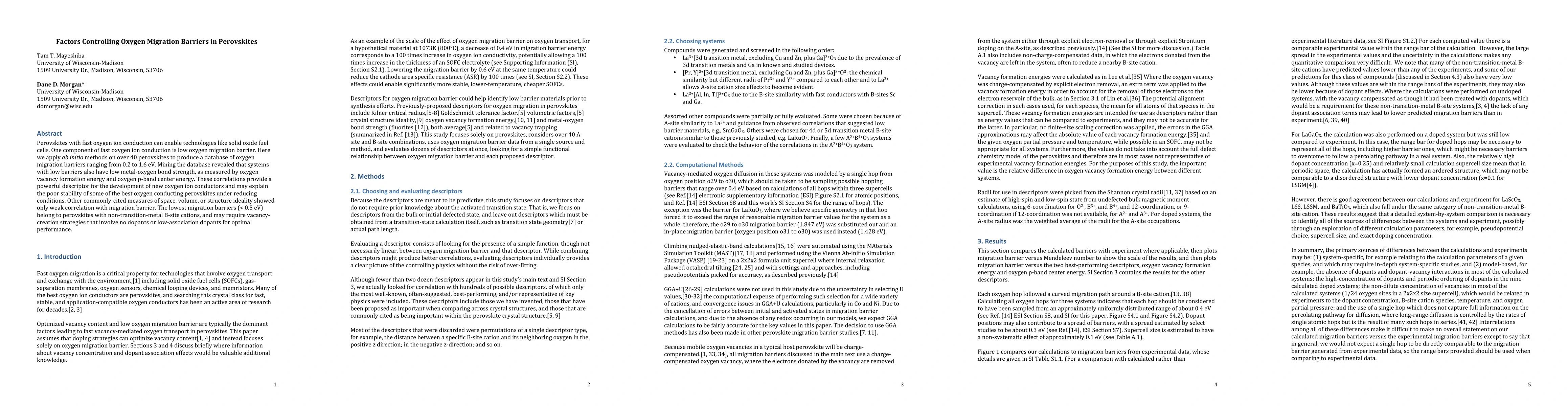 This study uses ab initio methods to analyze oxygen migration barriers in over 40 perovskites, finding low barriers correlate with weak metal-oxygen bonds. The lowest barriers (< 0.5 eV) occur in perovskites with non-transition metal B-site cations, suggesting optimal performance may require minimal dopants.