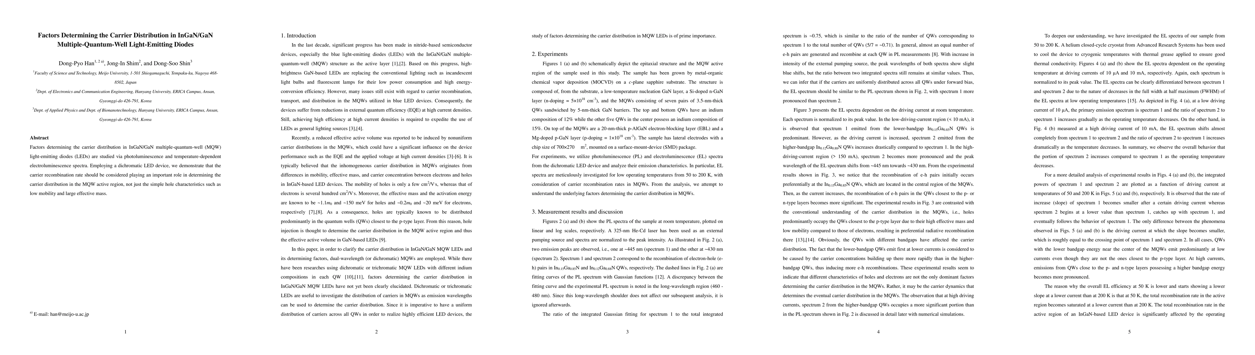 This paper investigates the factors influencing carrier distribution in InGaN/GaN multiple-quantum-well LEDs, emphasizing that carrier recombination rates are crucial, beyond just considering hole mobility and effective mass. Photoluminescence and electroluminescence studies reveal significant insights into the carrier dynamics in the active region.