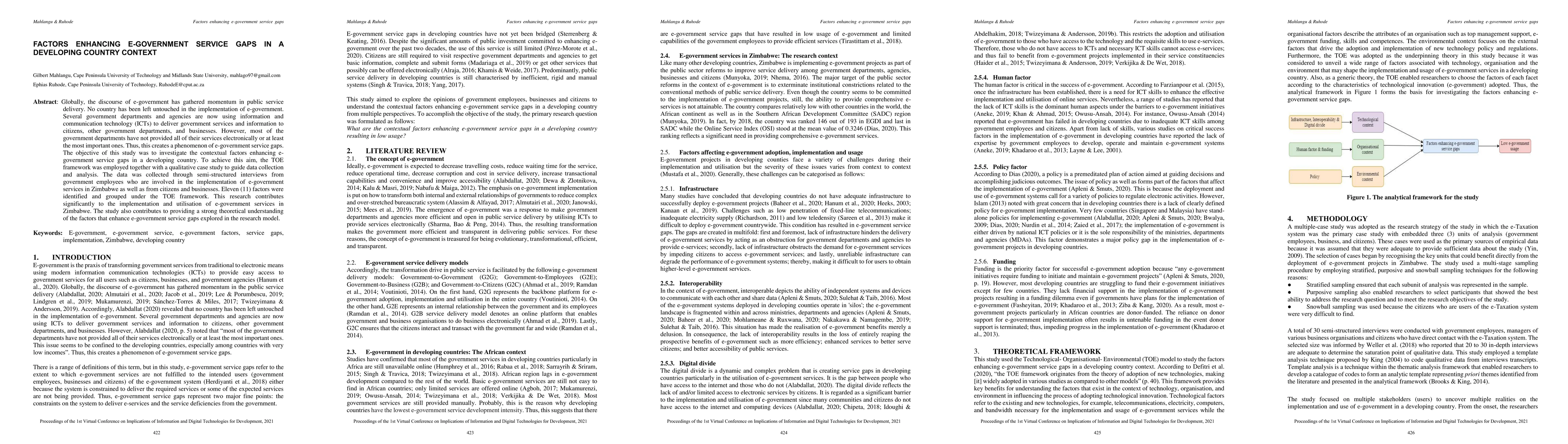 This study explores the contextual factors enhancing e-government service gaps in Zimbabwe using the TOE framework and qualitative case study methods. It identifies eleven factors grouped under technological, organizational, and environmental dimensions, contributing to the understanding of e-government implementation challenges in developing countries.