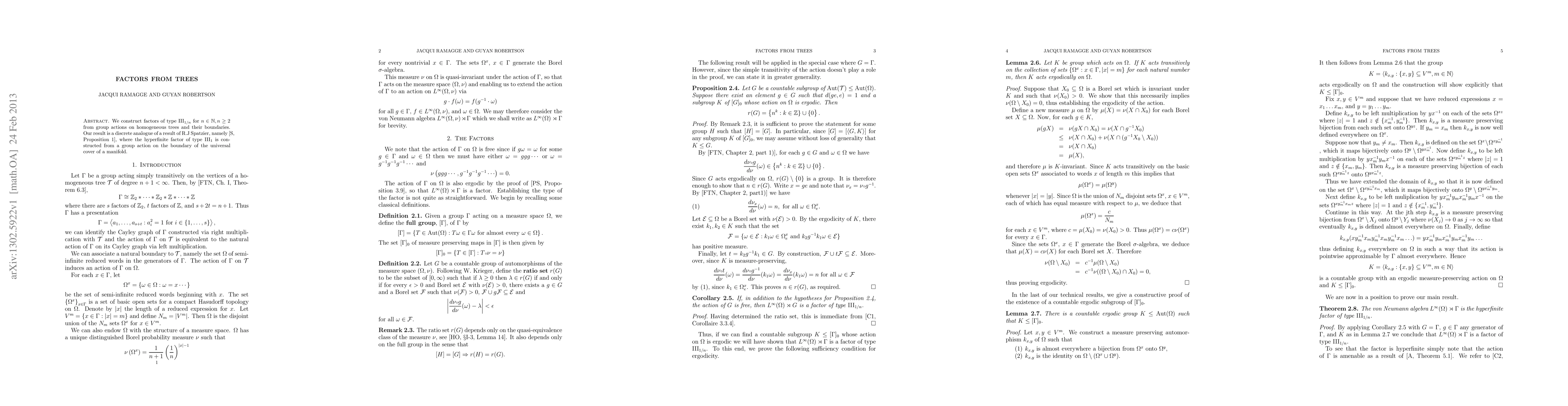 We construct factors of type $\tn$ for $n\in\NN, n\geq 2$ from group actions on homogeneous trees and their boundaries. Our result is a discrete analogue of a result of R.J Spatzier, where the hyperfinite factor of type $\tone$ is constructed from a group action on the boundary of the universal cover of a manifold.