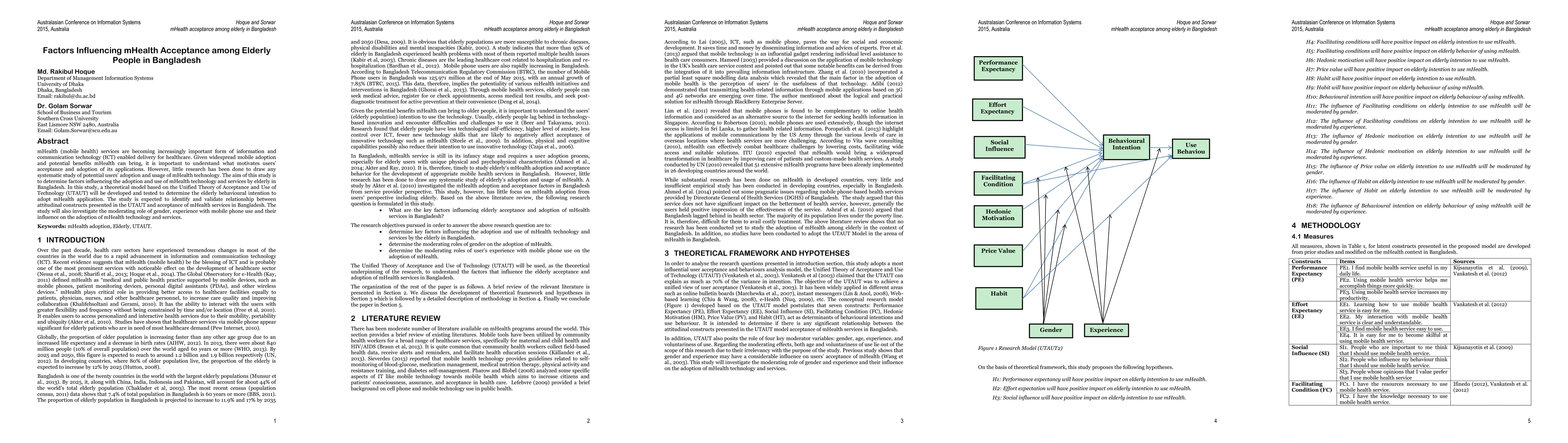 This study investigates factors influencing mHealth acceptance among elderly people in Bangladesh, focusing on behavioral intention to adopt mHealth applications. It aims to determine the relationships between constructs like Performance Expectancy, Effort Expectancy, and social influence, and examines the moderating effects of gender and experience on mHealth adoption.