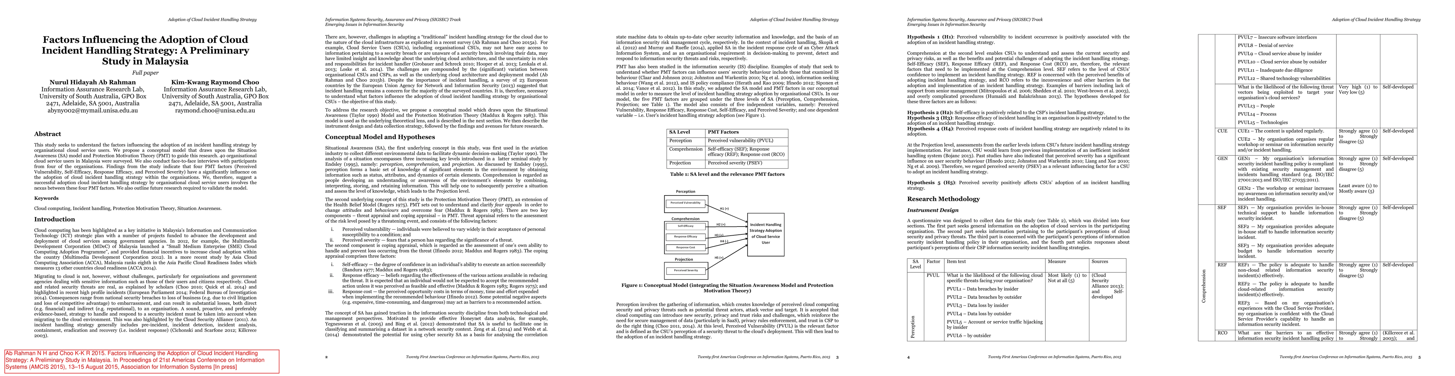 This study explores the factors influencing the adoption of cloud incident handling strategies among Malaysian organisational cloud service users, proposing a conceptual model based on the Situation Awareness model and Protection Motivation Theory. Findings reveal that four Protection Motivation Theory factors significantly impact adoption, suggesting a successful strategy requires these factors' interplay.