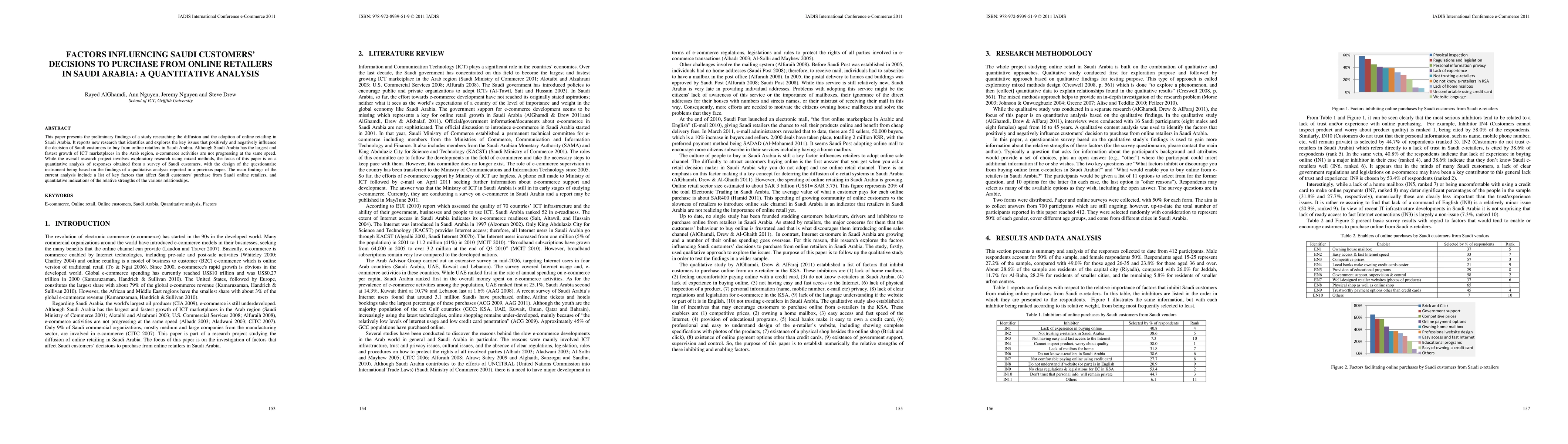 This paper presents the preliminary findings of a study researching the diffusion and the adoption of online retailing in Saudi Arabia. It reports new research that identifies and explores the key issues that positively and negatively influence the decision of Saudi customers to buy from online retailers in Saudi Arabia. Although Saudi Arabia has the largest and fastest growth of ICT marketplaces in the Arab region, e-commerce activities are not progressing at the same speed. While the overall research project involves exploratory research using mixed methods, the focus of this paper is on a quantitative analysis of responses obtained from a survey of Saudi customers, with the design of the questionnaire instrument being based on the findings of a qualitative analysis reported in a previous paper. The main findings of the current analysis include a list of key factors that affect Saudi customers' purchase from Saudi online retailers, and quantitative indications of the relative strengths of the various relationships.