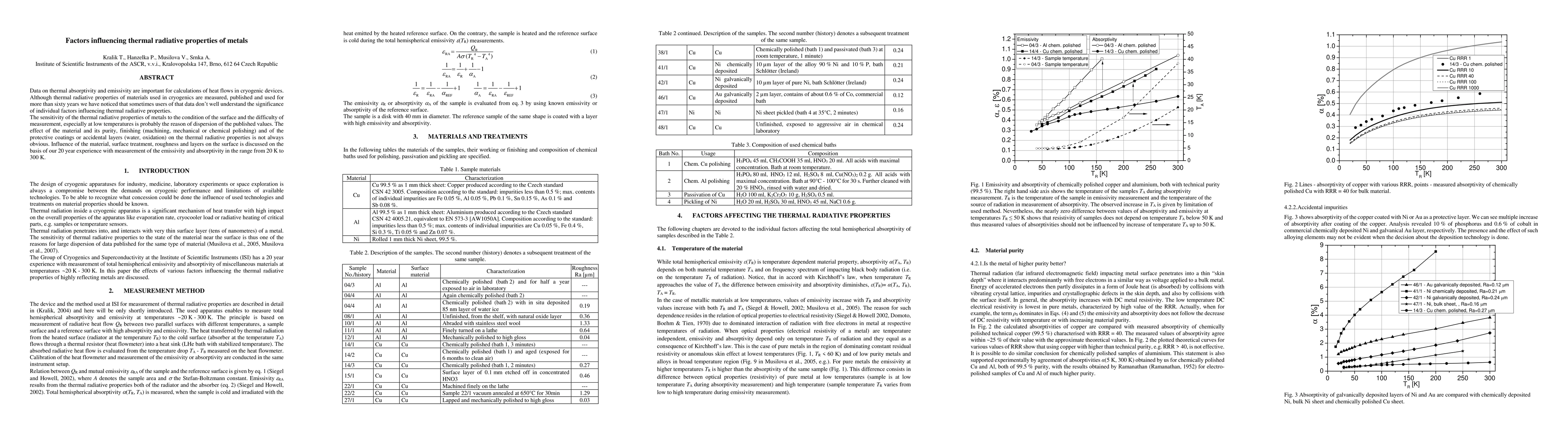 This paper discusses the factors influencing the thermal radiative properties of metals, emphasizing the importance of surface condition, material purity, and surface treatments in determining absorptivity and emissivity, especially in cryogenic devices. The study highlights the variability in published data due to measurement difficulties and the lack of understanding of these factors.