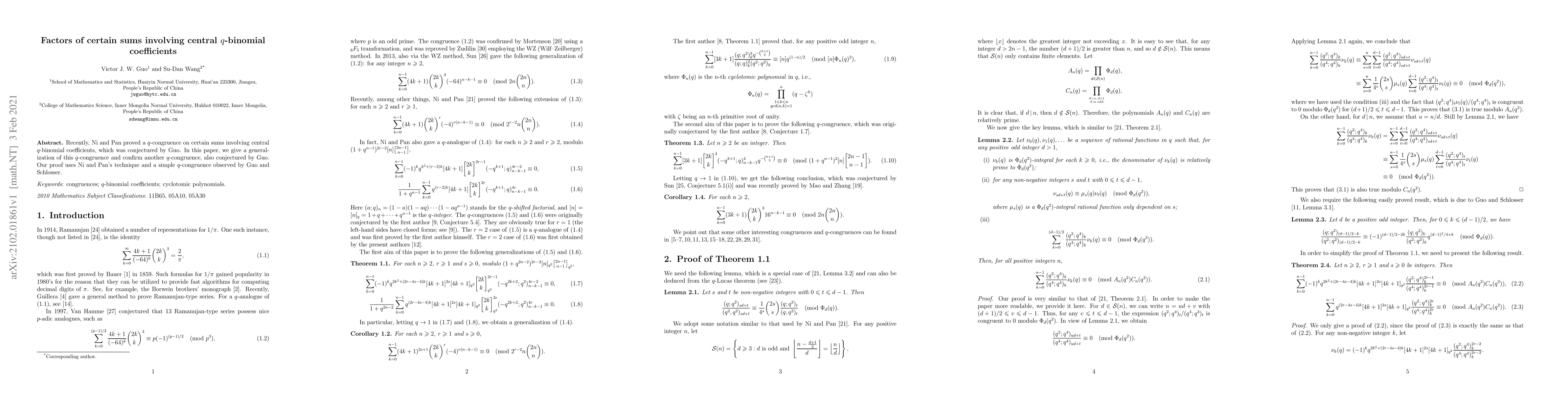 Recently, Ni and Pan proved a $q$-congruence on certain sums involving central $q$-binomial coefficients, which was conjectured by Guo. In this paper, we give a generalization of this $q$-congruence and confirm another $q$-congruence, also conjectured by Guo. Our proof uses Ni and Pan's technique and a simple $q$-congruence observed by Guo and Schlosser.