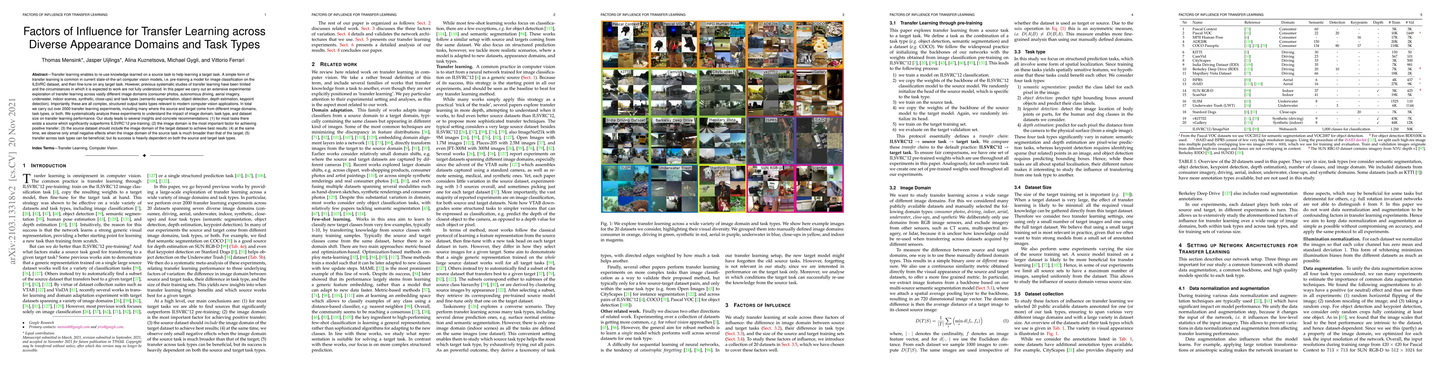 This paper explores transfer learning across diverse image domains and task types through extensive experiments, revealing that the image domain is the most critical factor for positive transfer, and that pre-training on a source dataset similar to the target domain yields the best results. The study also highlights the nuanced effects of transferring across different task types.