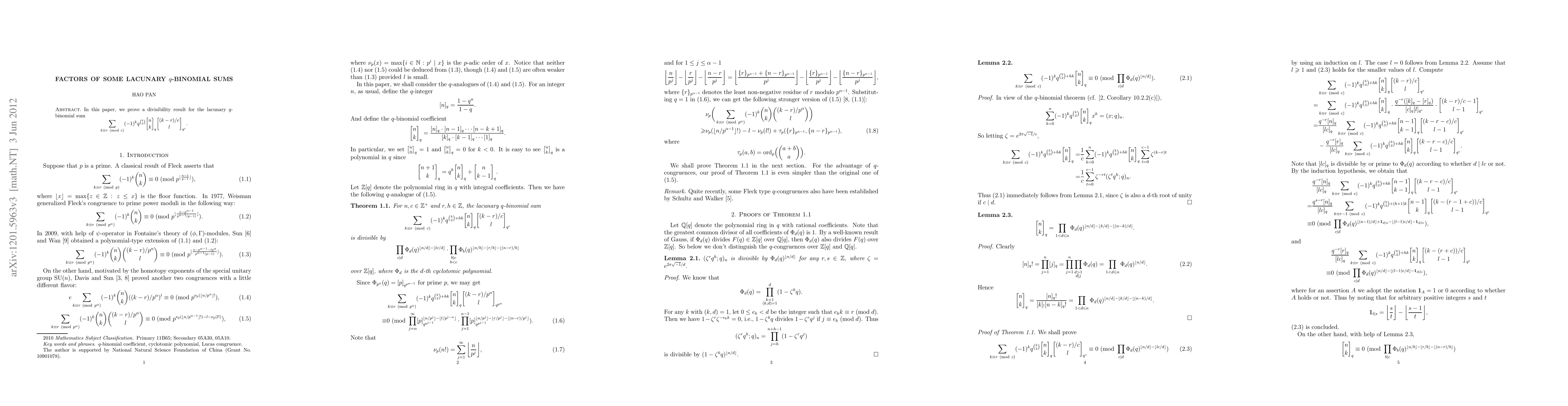 In this paper, we prove a divisibility result for the lacunary $q$-binomial sum $$ \sum_{k\equiv r\pmod{c}}(-1)^kq^{\binom{k}{2}}\qbinom{n}{k}{q}\qbinom{(k-r)/c}{l}{q^{c}}. $$