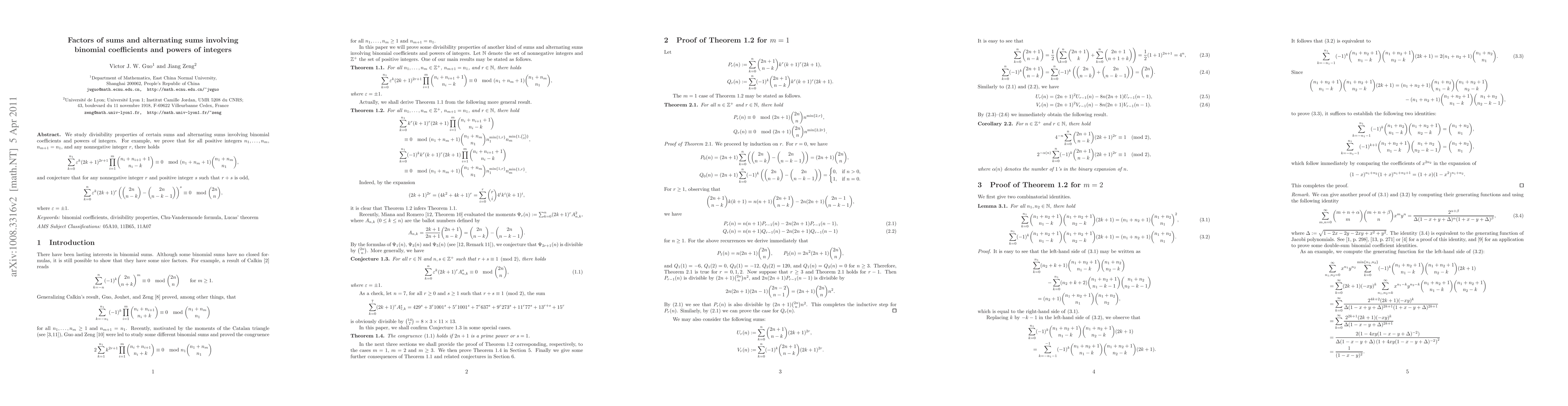 We study divisibility properties of certain sums and alternating sums involving binomial coefficients and powers of integers. For example, we prove that for all positive integers $n_1,..., n_m$, $n_{m+1}=n_1$, and any nonnegative integer $r$, there holds {align*} \sum_{k=0}^{n_1}\epsilon^k (2k+1)^{2r+1}\prod_{i=1}^{m} {n_i+n_{i+1}+1\choose n_i-k} \equiv 0 \mod (n_1+n_m+1){n_1+n_m\choose n_1}, {align*} and conjecture that for any nonnegative integer $r$ and positive integer $s$ such that $r+s$ is odd, $$ \sum_{k=0}^{n}\epsilon ^k (2k+1)^{r}({2n\choose n-k}-{2n\choose n-k-1})^{s} \equiv 0 \mod{{2n\choose n}}, $$ where $\epsilon=\pm 1$.