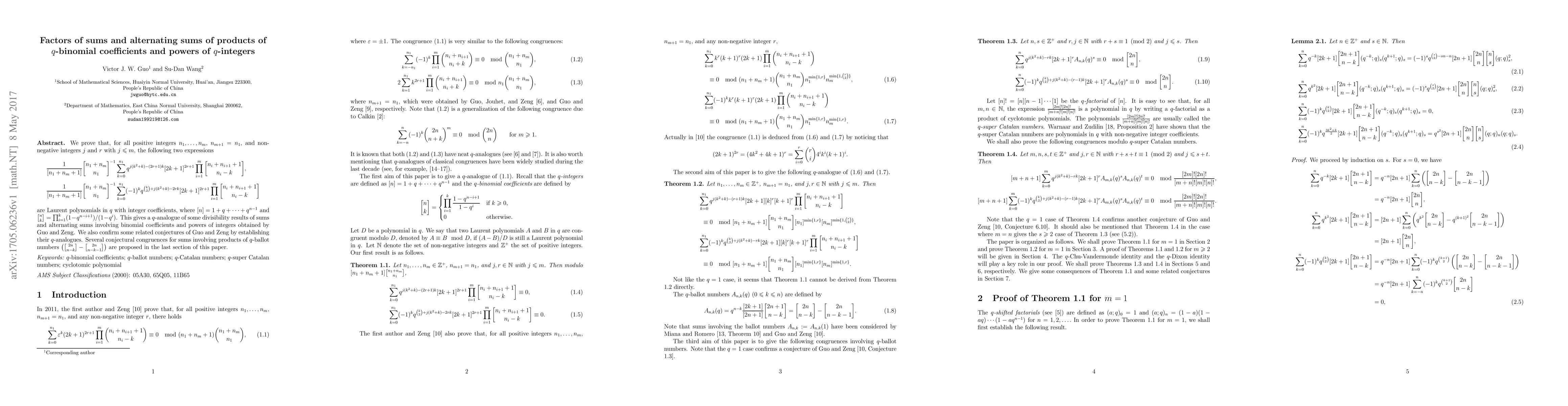 The paper establishes that certain expressions involving sums and alternating sums of products of $q$-binomial coefficients and powers of $q$-integers are Laurent polynomials in $q$ with integer coefficients, providing a $q$-analogue of known divisibility results and confirming related conjectures by Guo and Zeng. It also proposes new conjectural congruences for sums involving $q$-ballot numbers.