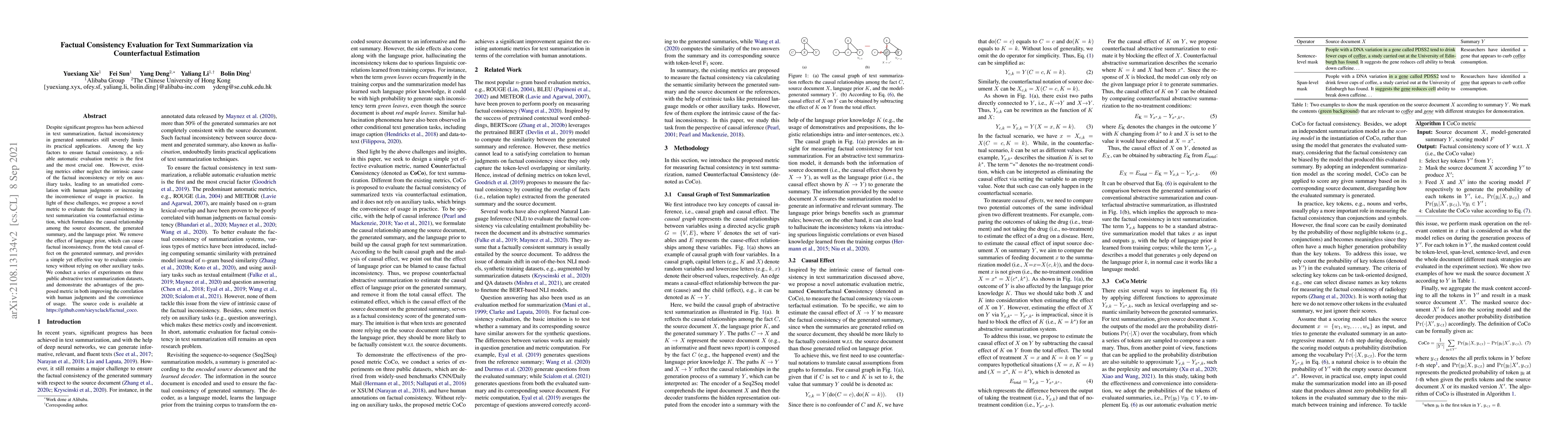 This paper proposes a novel counterfactual estimation metric for evaluating factual consistency in text summarization, aiming to improve correlation with human judgments and ease of use without relying on auxiliary tasks. Experiments on three public datasets show the effectiveness of the proposed method.