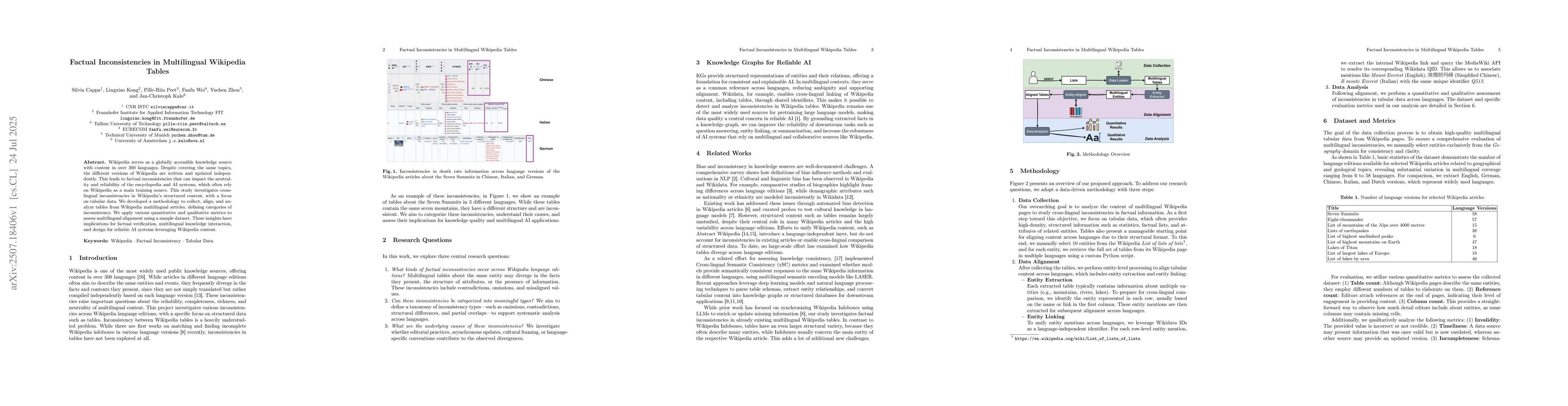 Wikipedia serves as a globally accessible knowledge source with content in over 300 languages. Despite covering the same topics, the different versions of Wikipedia are written and updated independently. This leads to factual inconsistencies that can impact the neutrality and reliability of the encyclopedia and AI systems, which often rely on Wikipedia as a main training source. This study investigates cross-lingual inconsistencies in Wikipedia's structured content, with a focus on tabular data. We developed a methodology to collect, align, and analyze tables from Wikipedia multilingual articles, defining categories of inconsistency. We apply various quantitative and qualitative metrics to assess multilingual alignment using a sample dataset. These insights have implications for factual verification, multilingual knowledge interaction, and design for reliable AI systems leveraging Wikipedia content.