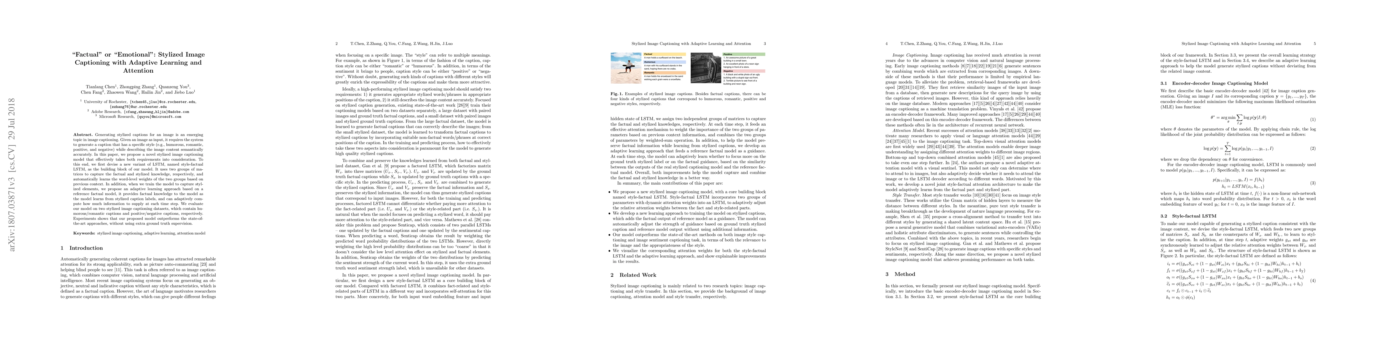 This paper proposes a novel stylized image captioning model that generates captions with specific styles while maintaining semantic accuracy. It introduces a style-factual LSTM and an adaptive learning approach to balance factual and stylized elements, outperforming existing methods on stylized captioning datasets.