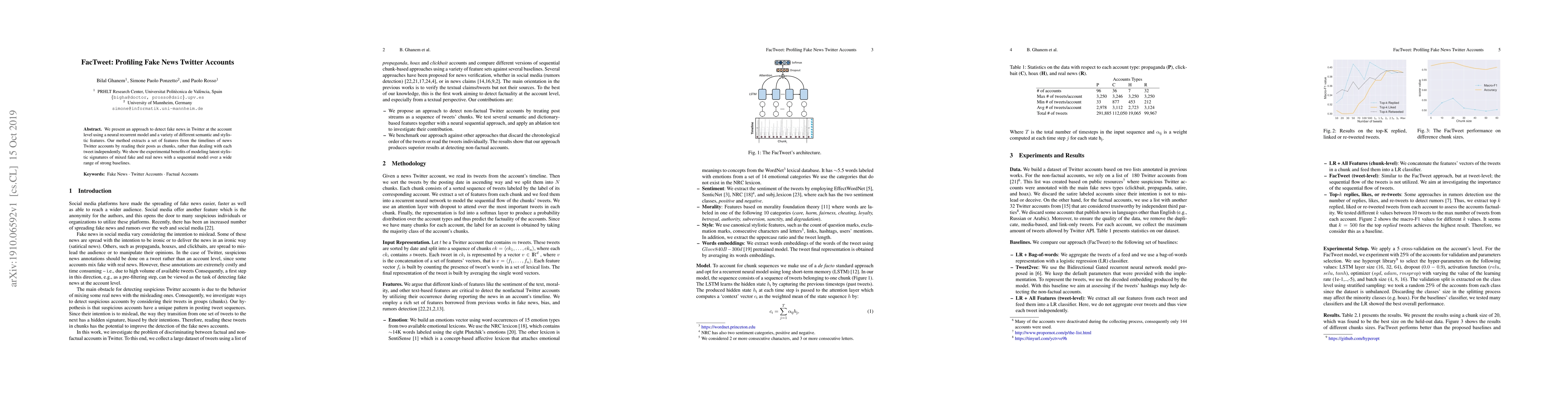We present an approach to detect fake news in Twitter at the account level using a neural recurrent model and a variety of different semantic and stylistic features. Our method extracts a set of features from the timelines of news Twitter accounts by reading their posts as chunks, rather than dealing with each tweet independently. We show the experimental benefits of modeling latent stylistic signatures of mixed fake and real news with a sequential model over a wide range of strong baselines.