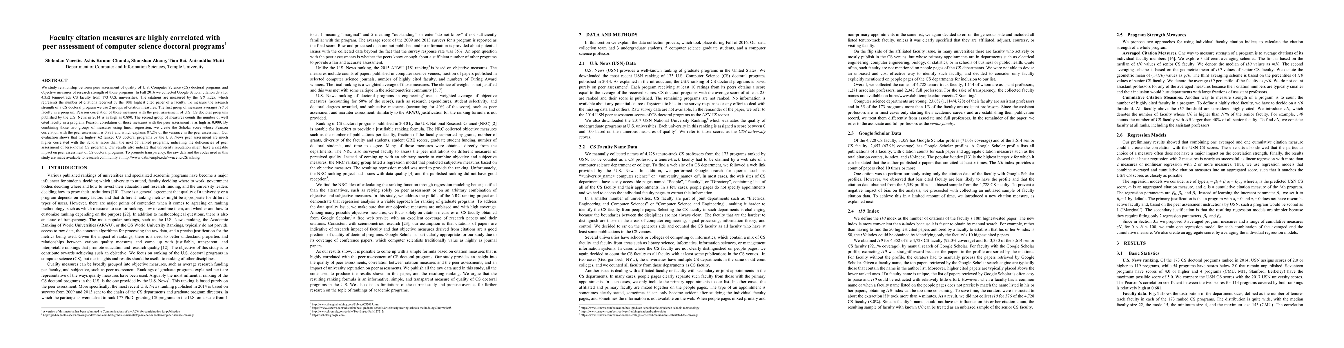 This study finds a strong correlation between faculty citation measures and peer assessments of U.S. Computer Science doctoral programs, with Pearson correlations as high as 0.933. The research highlights deficiencies in the peer assessment of less-known programs and suggests university reputation impacts these evaluations.