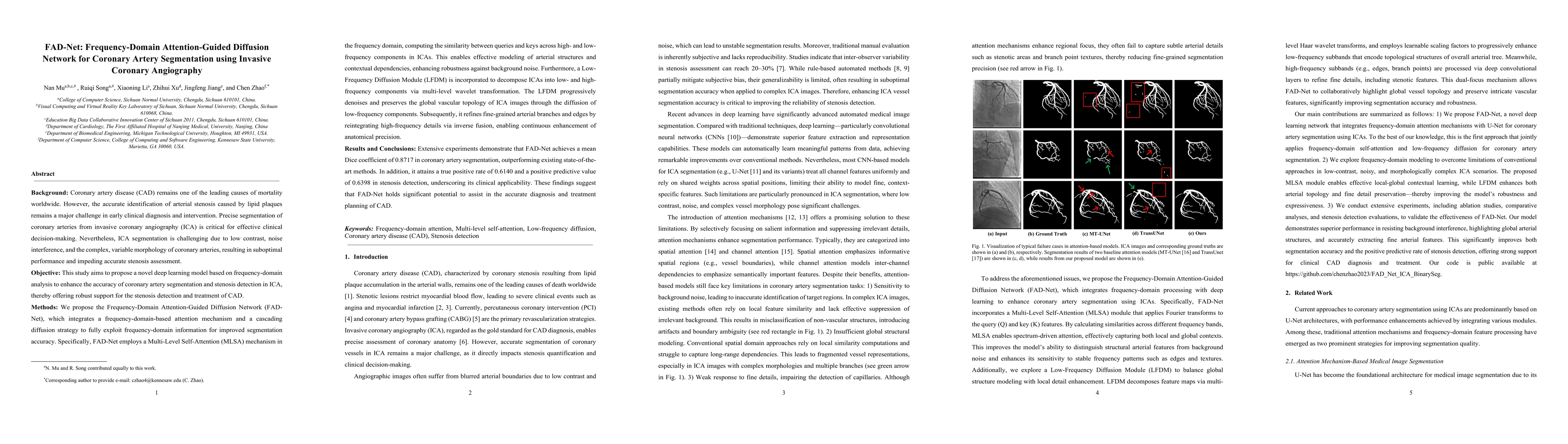 Background: Coronary artery disease (CAD) remains one of the leading causes of mortality worldwide. Precise segmentation of coronary arteries from invasive coronary angiography (ICA) is critical for effective clinical decision-making. Objective: This study aims to propose a novel deep learning model based on frequency-domain analysis to enhance the accuracy of coronary artery segmentation and stenosis detection in ICA, thereby offering robust support for the stenosis detection and treatment of CAD. Methods: We propose the Frequency-Domain Attention-Guided Diffusion Network (FAD-Net), which integrates a frequency-domain-based attention mechanism and a cascading diffusion strategy to fully exploit frequency-domain information for improved segmentation accuracy. Specifically, FAD-Net employs a Multi-Level Self-Attention (MLSA) mechanism in the frequency domain, computing the similarity between queries and keys across high- and low-frequency components in ICAs. Furthermore, a Low-Frequency Diffusion Module (LFDM) is incorporated to decompose ICAs into low- and high-frequency components via multi-level wavelet transformation. Subsequently, it refines fine-grained arterial branches and edges by reintegrating high-frequency details via inverse fusion, enabling continuous enhancement of anatomical precision. Results and Conclusions: Extensive experiments demonstrate that FAD-Net achieves a mean Dice coefficient of 0.8717 in coronary artery segmentation, outperforming existing state-of-the-art methods. In addition, it attains a true positive rate of 0.6140 and a positive predictive value of 0.6398 in stenosis detection, underscoring its clinical applicability. These findings suggest that FAD-Net holds significant potential to assist in the accurate diagnosis and treatment planning of CAD.