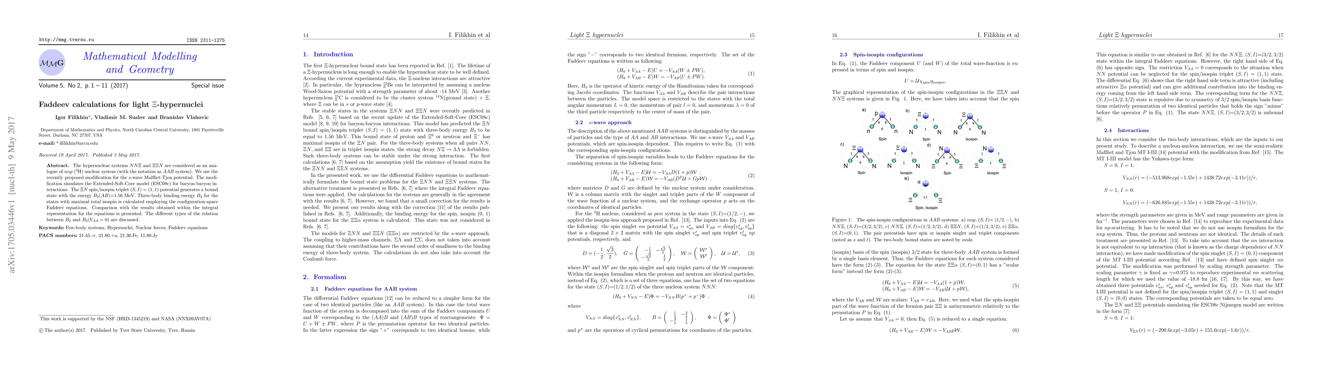 The hypernuclear systems $NN\Xi $ and $\Xi\Xi N$ are considered as an analogue of $nnp$ ($^3$H) nuclear system (with the notation as $AAB$ system). We use the recently proposed modification for the $s$-wave Malfliet-Tjon potential. The modification simulates the Extended-Soft-Core model (ESC08c) for baryon-baryon interactions. The $\Xi N$ spin/isospin triplet $(S, I)=(1, 1)$ potential generates a bound state with the energy $B_2(AB)$=1.56~MeV. Three-body binding energy $B_3$ for the states with maximal total isospin is calculated employing the configuration-space Faddeev equations. Comparison with the results obtained within the integral representation for the equations is presented. The different types of the relation between $B_2$ and $B_3(V_{AA}=0)$ are discussed.