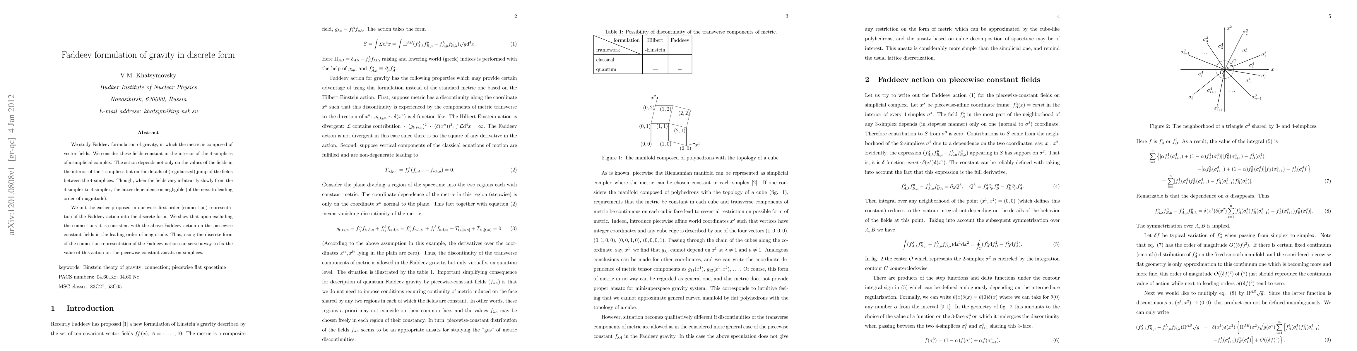 This paper explores the Faddeev formulation of gravity, where the metric is represented by vector fields, and presents a discrete form of the action dependent on both field values and their jumps between 4-simplices. The authors show that their first-order connection representation aligns with the original Faddeev action for piecewise constant fields, providing a method to determine the action on such configurations.