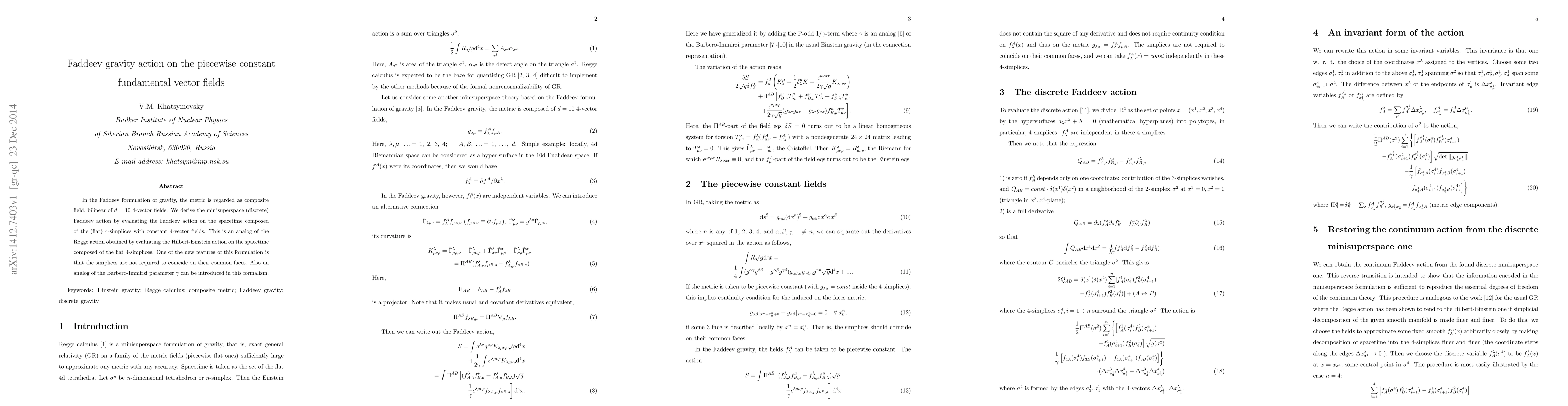 This paper derives the minisuperspace Faddeev gravity action by evaluating the Faddeev action on a piecewise constant fundamental vector field composed of flat 4-simplices, introducing a new feature where simplices do not need to coincide on common faces, and parallels the Barbero-Immirzi parameter in this formulation.