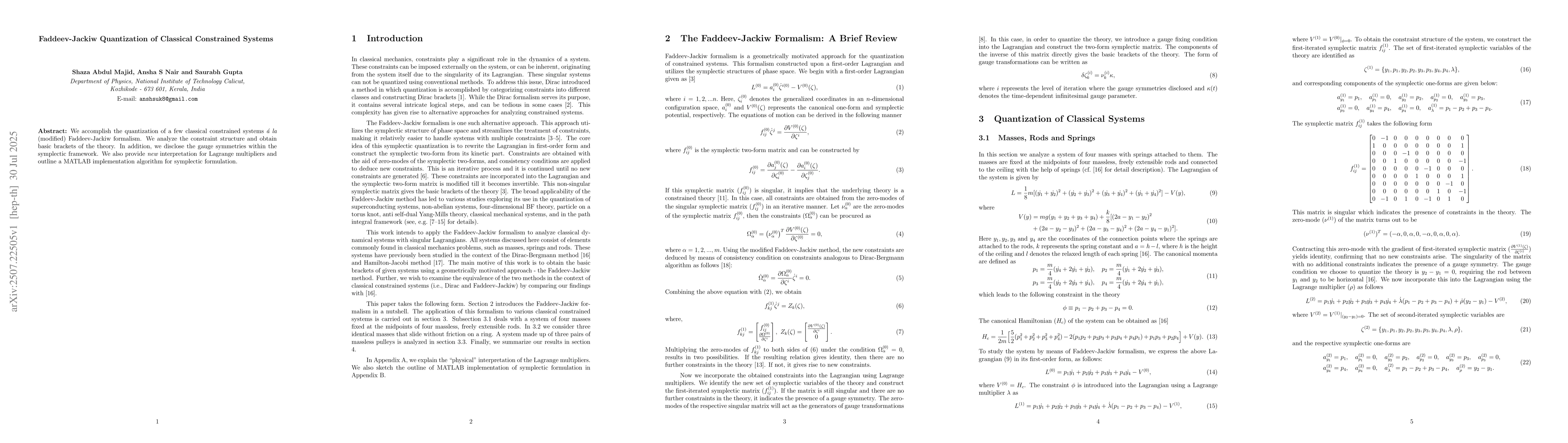 The paper presents a detailed analysis and quantization of classical constrained systems using the Faddeev-Jackiw formalism, including a MATLAB implementation for symplectic formulation and constraint handling.
