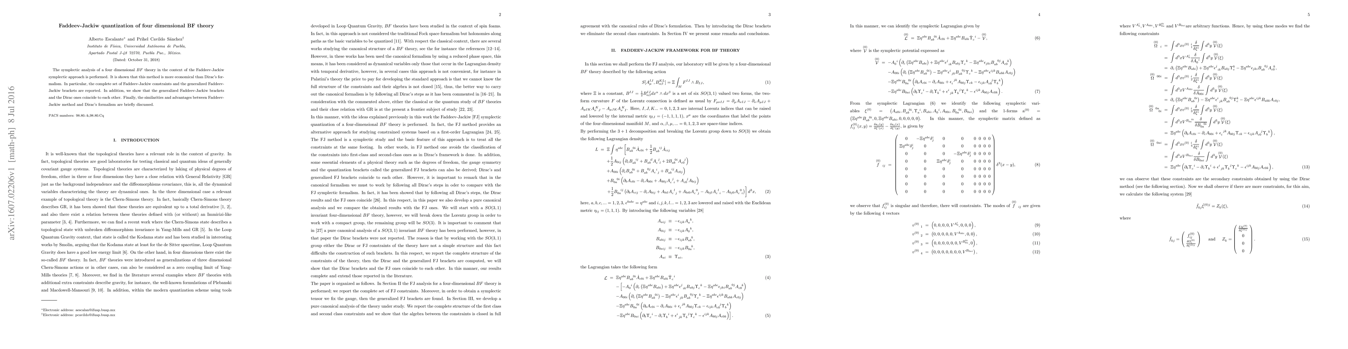 This paper employs the Faddeev-Jackiw method to analyze four-dimensional BF theory, demonstrating it to be more efficient than Dirac's formalism. It identifies a complete set of Faddeev-Jackiw constraints and shows the equivalence of generalized Faddeev-Jackiw brackets with Dirac brackets.