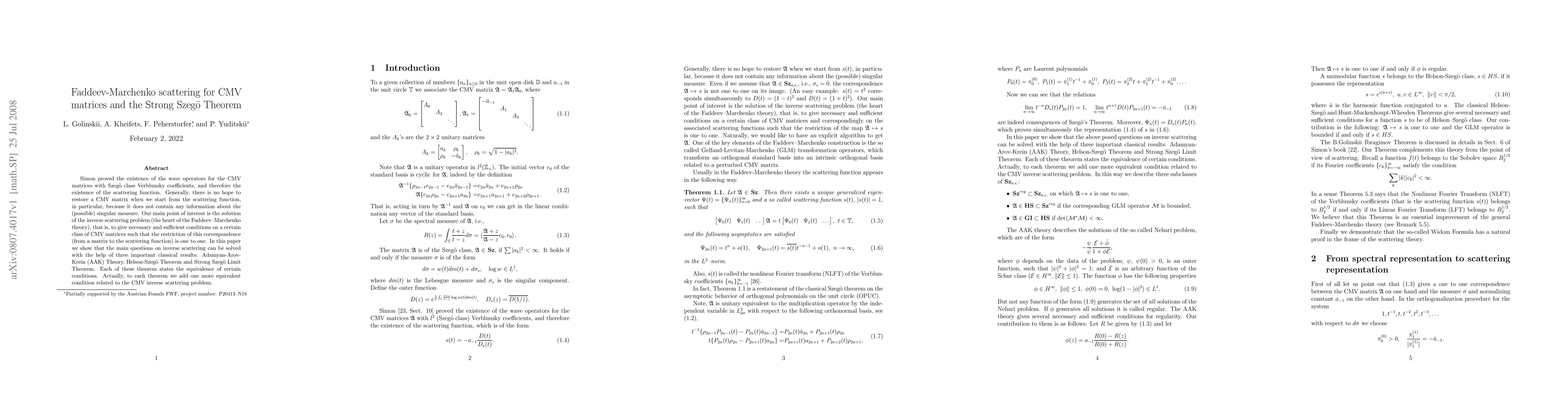 B. Simon proved the existence of the wave operators for the CMV matrices with Szego class Verblunsky coefficients, and therefore the existence of the scattering function. Generally, there is no hope to restore a CMV matrix when we start from the scattering function, in particular, because it does not contain any information about the (possible) singular measure. Our main point of interest is the solution of the inverse scattering problem (the heart of the Faddeev--Marchenko theory), that is, to give necessary and sufficient conditions on a certain class of CMV matrices such that the restriction of this correspondence (from a matrix to the scattering function) is one to one. In this paper we show that the main questions on inverse scattering can be solved with the help of three important classical results: Adamyan-Arov-Krein (AAK) Theory, Helson-Szego Theorem and Strong Szego Limit Theorem. Each of these theorem states the equivalence of certain conditions. Actually, to each theorem we add one more equivalent condition related to the CMV inverse scattering problem.