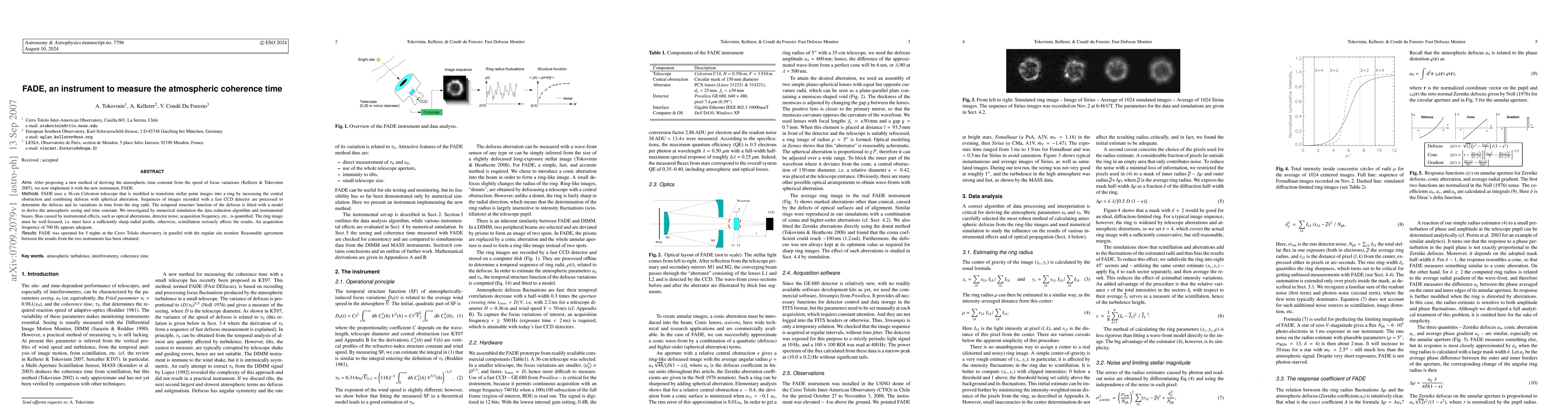 After proposing a new method of deriving the atmospheric time constant from the speed of focus variations (Kellerer & Tokovinin 2007), we now implement it with the new instrument, FADE. FADE uses a 36-cm Celestron telescope that is modified to transform stellar point images into a ring by increasing the central obstruction and combining defocus with spherical aberration. Sequences of images recorded with a fast CCD detector are processed to determine the defocus and its variations in time from the ring radii. The temporal structure function of the defocus is fitted with a model to derive the atmospheric seeing and time constant. We investigated by numerical simulation the data reduction algorithm and instrumental biases. Bias caused by instrumental effects, such as optical aberrations, detector noise, acquisition frequency, etc., is quantified. The ring image must be well-focused, i.e. must have a sufficiently sharp radial profile, otherwise, scintillation seriously affects the results. An acquisition frequency of 700 Hz appears adequate. FADE was operated for 5 nights at the Cerro Tololo observatory in parallel with the regular site monitor. Reasonable agreement between the results from the two instruments has been obtained.