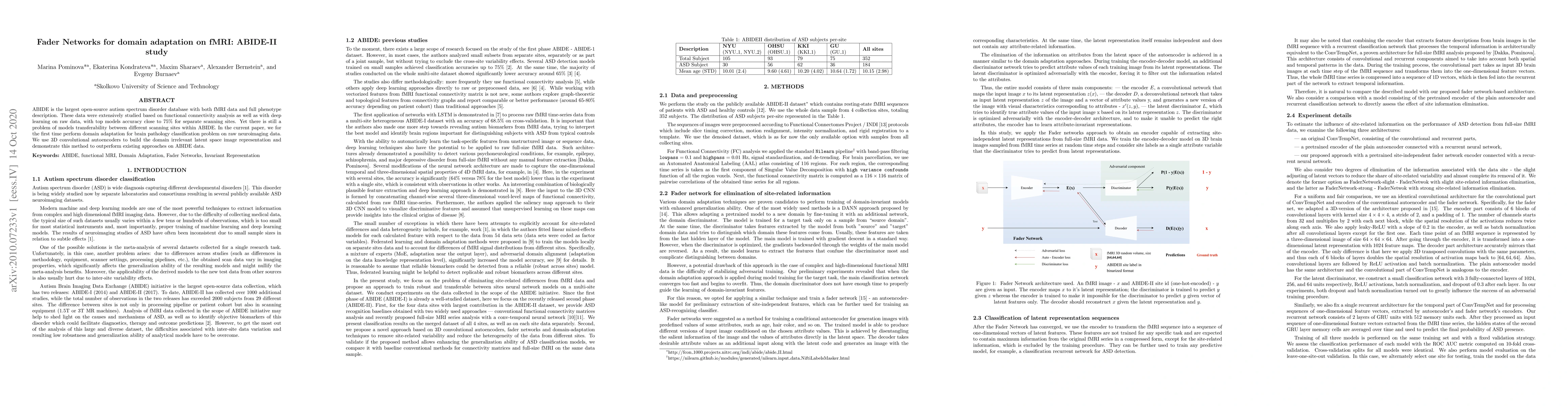 This paper introduces a domain adaptation method using fader networks and 3D convolutional autoencoders to improve the transferability of models across different scanning sites in the ABIDE dataset for autism spectrum disorder classification, achieving superior performance compared to existing methods.