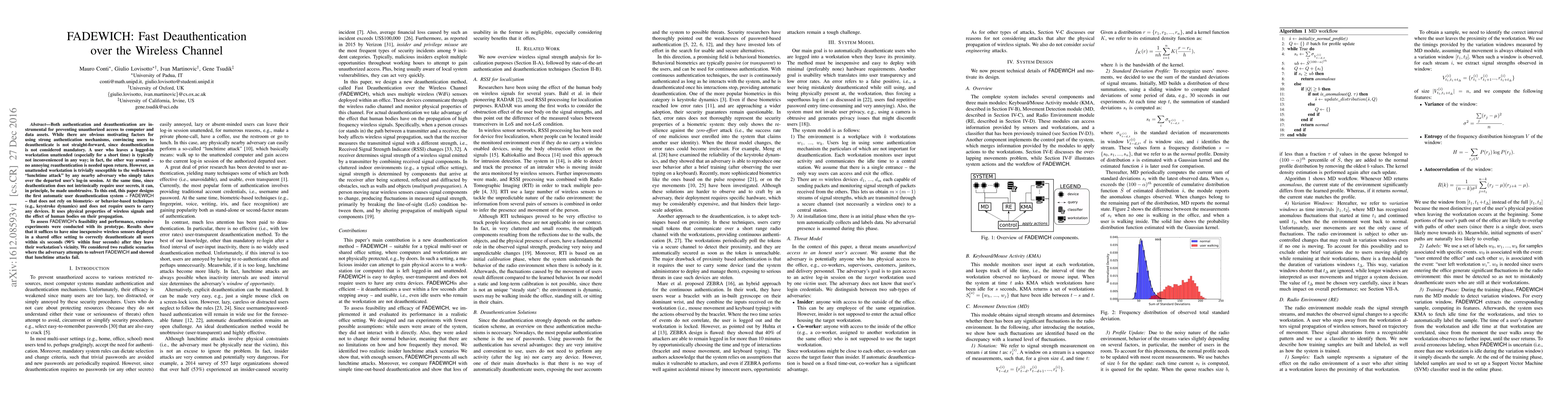 FADEWICH is an automatic user deauthentication system that leverages physical properties of wireless signals to unobtrusively log users out when they leave their workstation, preventing "lunchtime attacks." Experiments show it can deauthenticate users within six seconds using nine wireless sensors, effectively thwarting unauthorized access attempts.