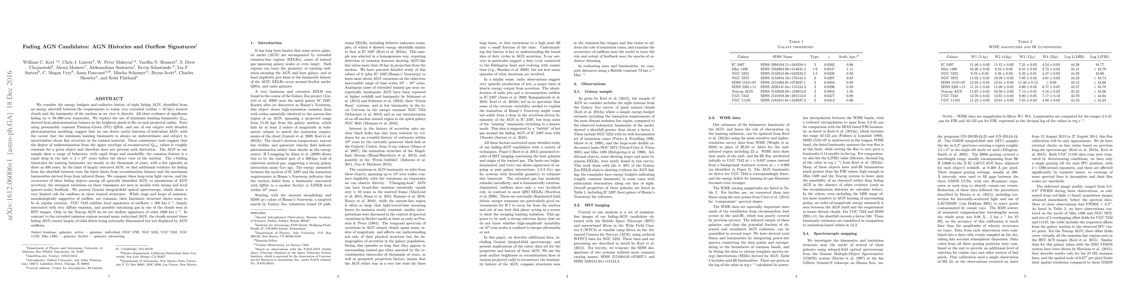 We consider energy budgets and radiative history of 8 fading AGN, identified from mismatch between the ionizion of very extended (>10 kpc) ionized clouds and the luminosity of the nucleus viewed directly. All show significant fading on ~50,000-year timescales. We explore the use of minimum ionizing luminosity Q derived from photoionization balance in the brightest pixels in H-alpha at each projected radius. Tests using PG QSOs, and one target with detailed photoionization modeling, suggest that we can derive useful histories of individual AGN; the minimum ionizing luminosity is always an underestimate and subject to fine structure in the ionized material. These tests suggest that the underestimation from the upper envelope of Q values is roughly constant for a given object. These AGN show rapid drops and standstills; the common feature is a rapid drop in the last 20,000 years before our view of the nucleus. E-folding timescales are mostly thousands of years, with a few episodes as short as 400. In the limit of largely obscured AGN, we find additional evidence for fading, comparing lower limits from recombination balance and the maximum luminosities derived from from infrared fluxes. We compare these long-term light curves to simulations of AGN accretion; the strongest variations on these timespans are seen in models with strong and local feedback. Gemini integral-field optical spectroscopy shows a very limited role for outflows in these structures. While rings and loops of emission are common, their kinematic structure shows some to be in regular rotation. UGC 7342 exhibits local signatures of outflows <300 km/s, largely associated with very diffuse emission. Only in the Teacup AGN do we see outflow signatures of order 1000 km/s. Clouds around these fading AGN consist largely of tidal debris being externally illuminated but not displaced by AGN outflows. (Abridged)