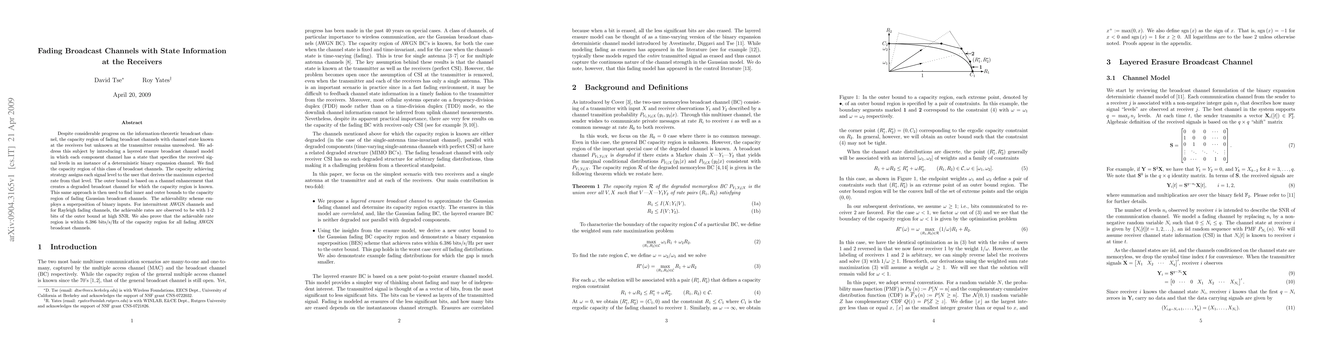 This paper resolves the capacity region for fading broadcast channels where state information is available at receivers but not the transmitter. It introduces a layered erasure model and finds the capacity region using a superposition strategy, proving the achievable rates are close to the outer bound for high SNR.