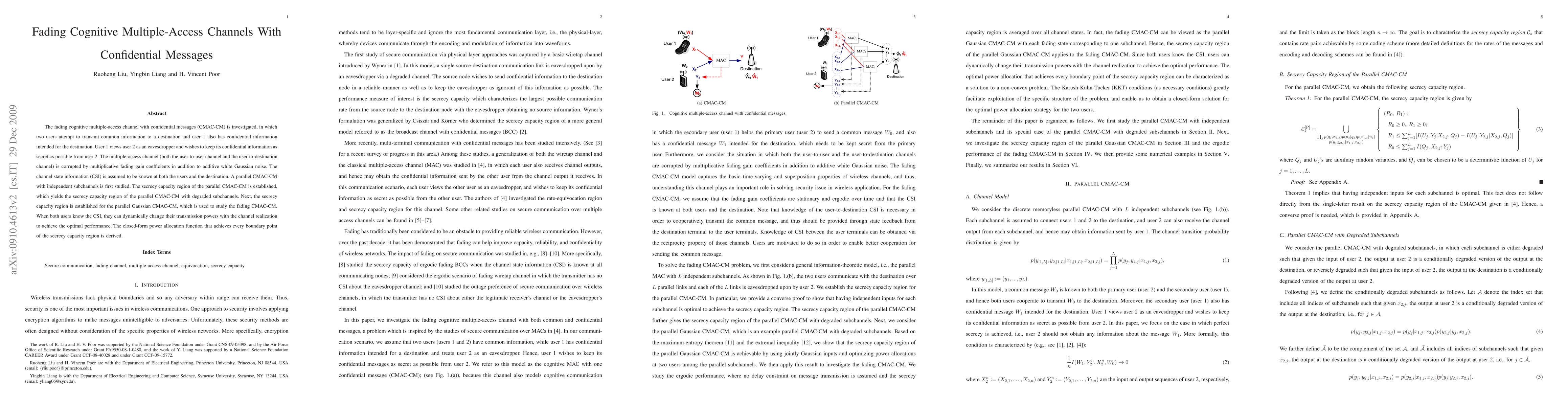 This paper investigates the fading cognitive multiple-access channel with confidential messages, focusing on optimal power allocation to maximize secrecy capacity. It establishes the secrecy capacity region for both parallel and degraded subchannels and derives a closed-form power allocation function for achieving optimal performance.