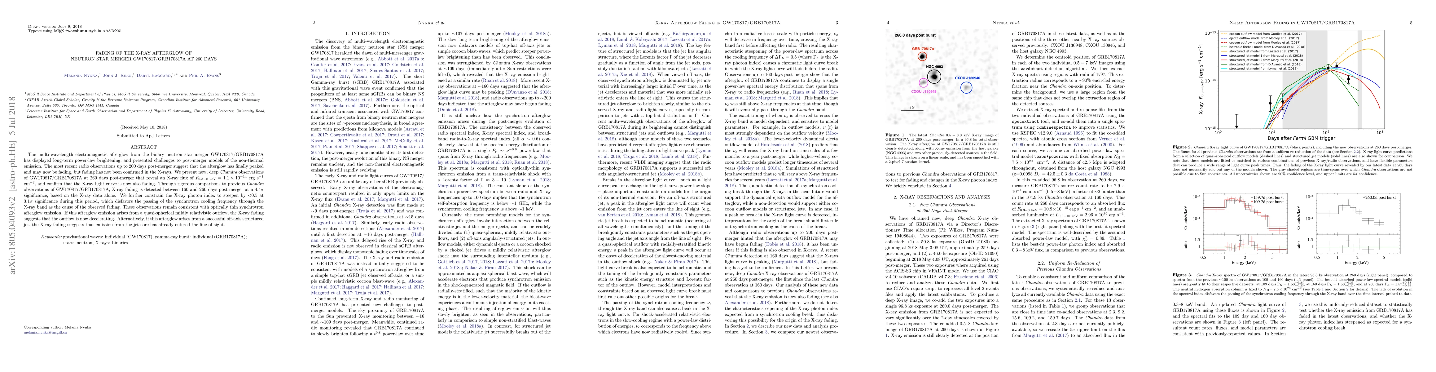 The paper confirms X-ray fading in the afterglow of neutron star merger GW170817/GRB170817A at 260 days post-merger, detected at a 4.4 sigma significance, and suggests deceleration of the outflow or entry of the jet core into the line of sight. The X-ray photon index steepens, ruling out synchrotron cooling frequency as the cause of fading.