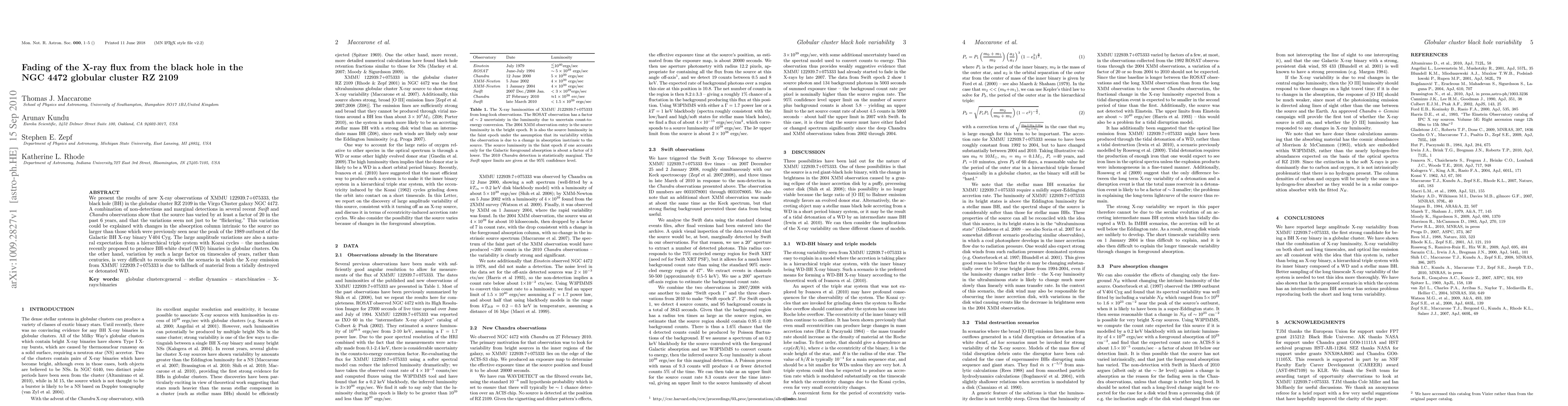 The research examines XMMU 122939.7+075333, a black hole in NGC 4472's globular cluster RZ 2109, finding significant X-ray flux variations by a factor of 20 over 6 years. These fluctuations may result from changes in intrinsic absorption or hierarchical triple system Kozai cycles, but are challenging to explain via fallback of material from a tidally disrupted white dwarf on yearly timescales.