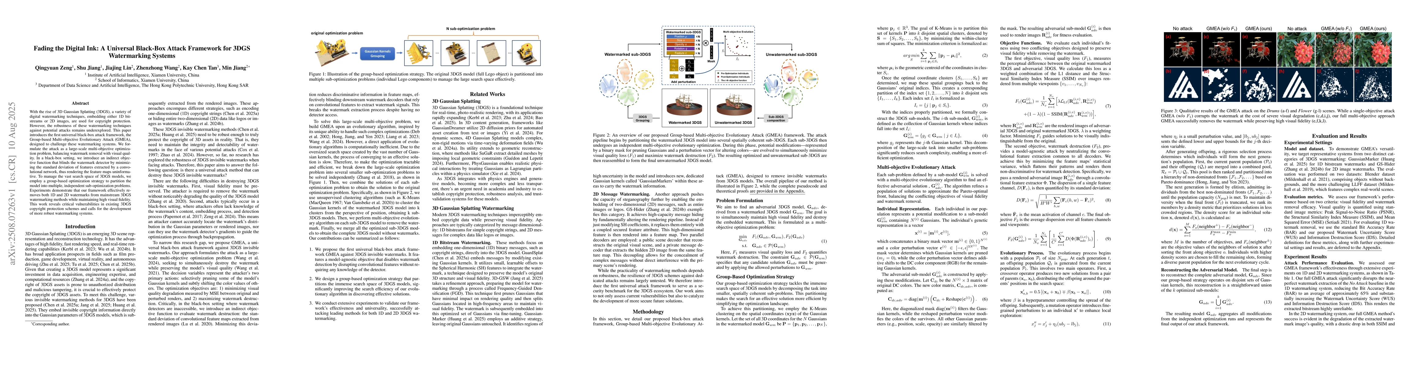The research employs a universal black-box attack framework, Group-based Multi-objective Evolutionary Attack (GMEA), targeting 3D Gaussian Splatting (3DGS) watermarking systems. It formulates the attack as a large-scale multi-objective optimization problem, balancing watermark removal with visual quality.